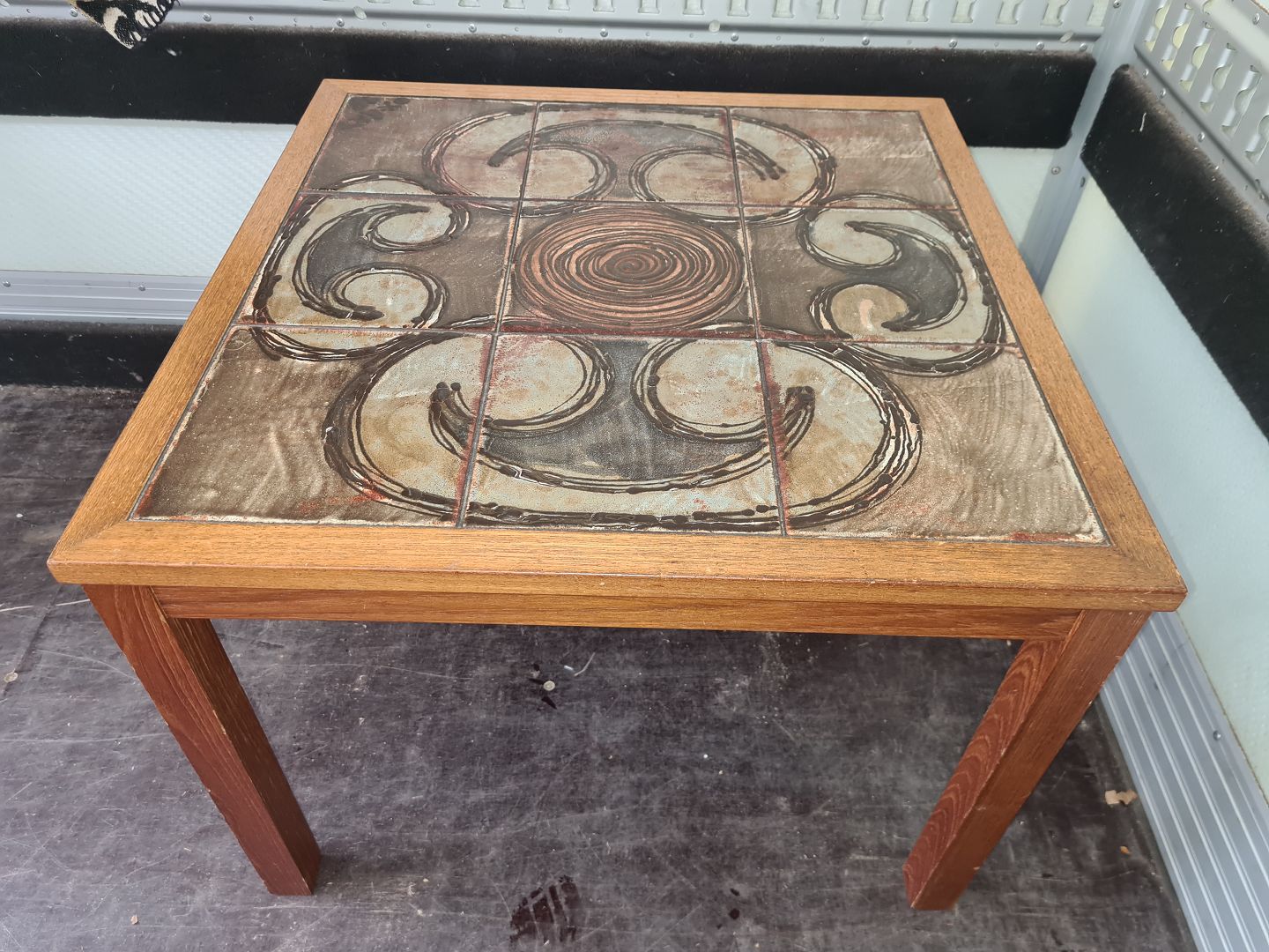 Sofabord fra 1970´erne i eg og med kakler. Bordet fremstår godt og stabilt dog med en lille flænge i en af kaklerne. (billede) Emne nummer: 80467