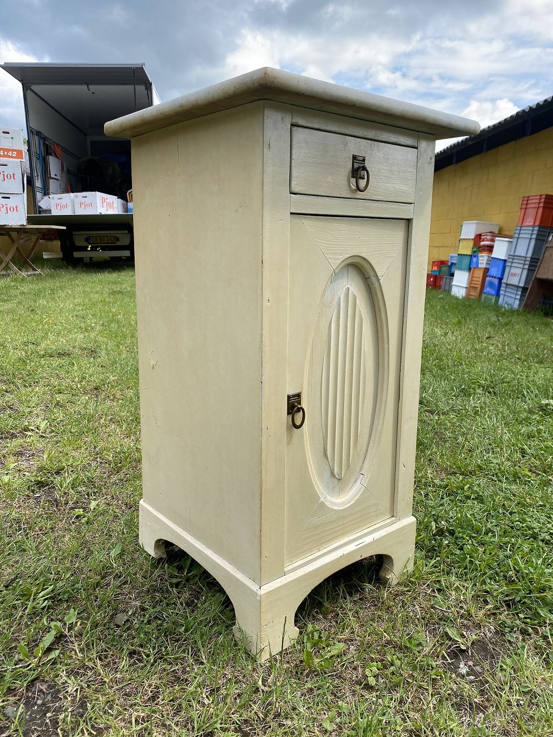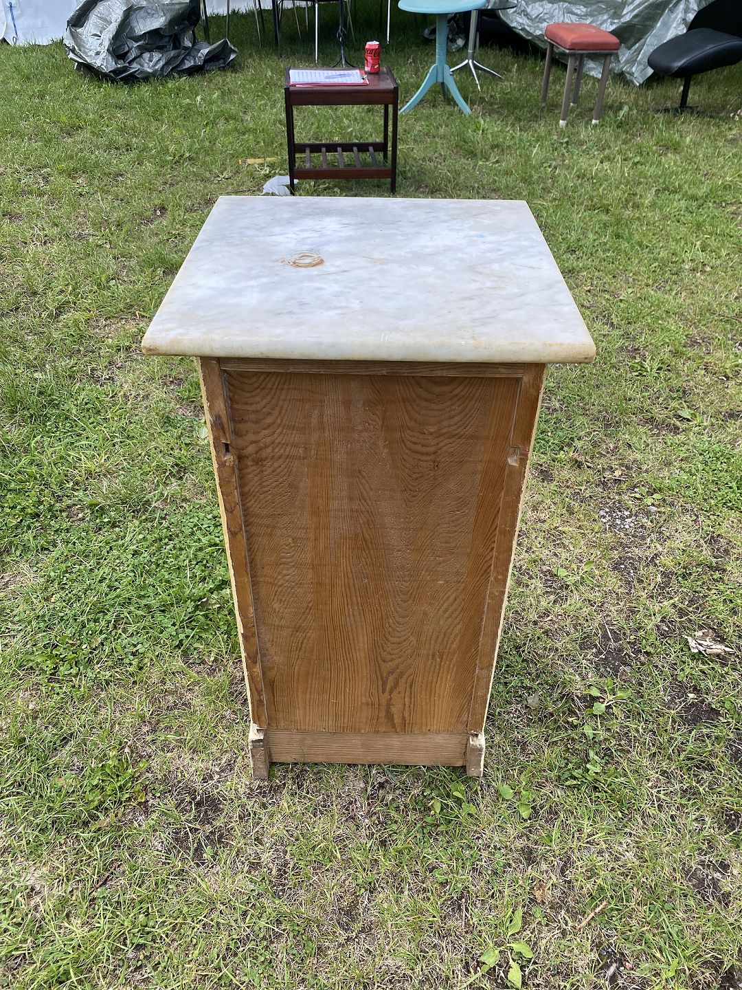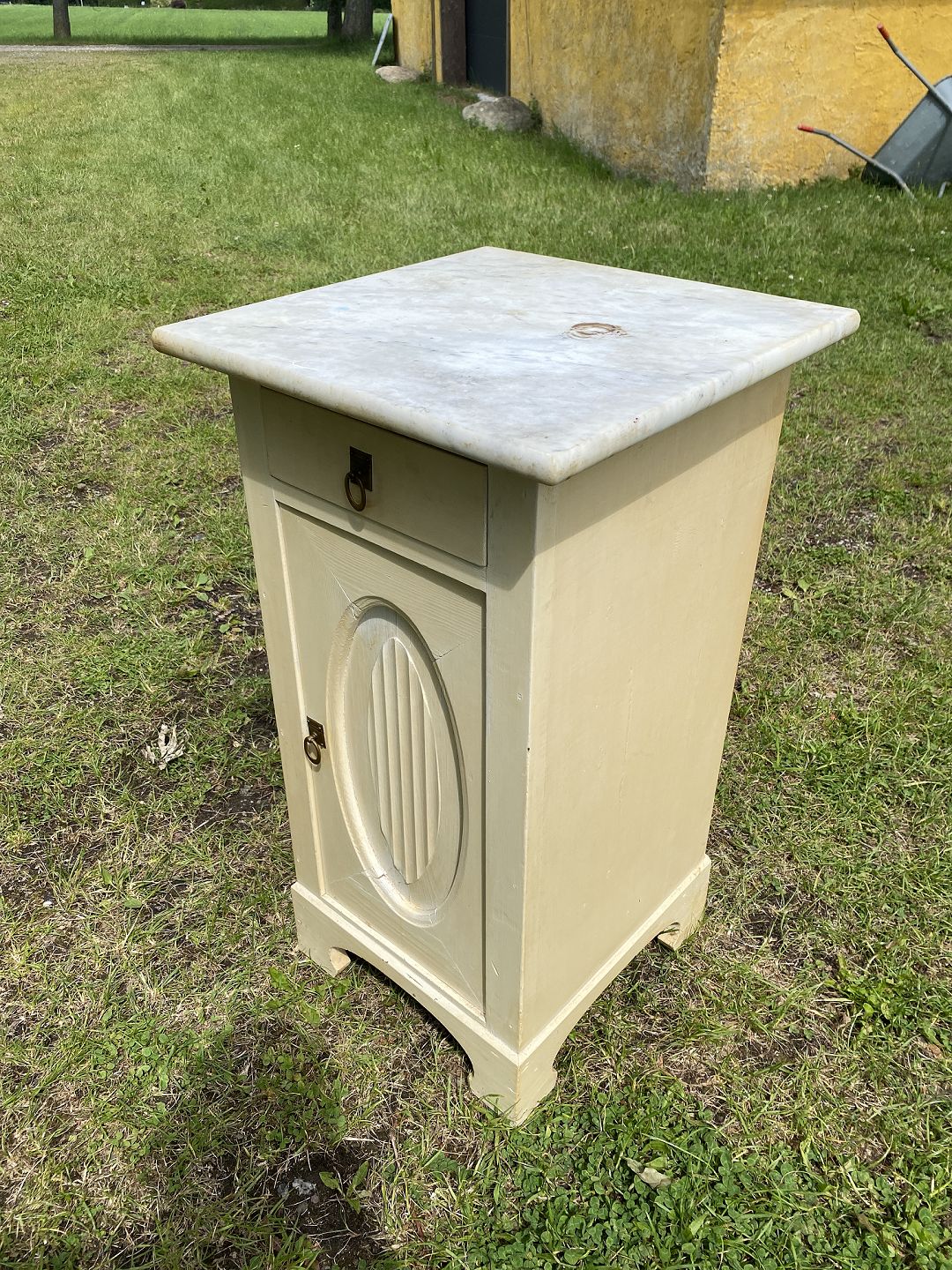Malet savante i fyrtræ med marmorplade fra ca 1920'erne. Det har brugsspor og mangler en kile på det ene bagben. Højde 75 cm. Bredde 35 cm. Dybde 37 cm. Pladen 42x42x2cm Emne nummer: 90651