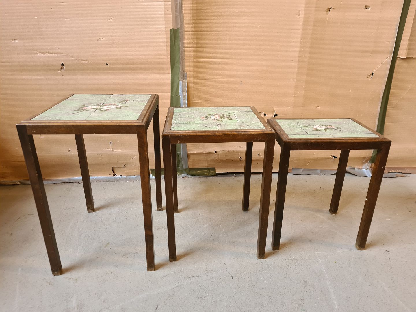 3 Indskudsborde i birketræ, fra 1930erne. De har brugsspor. Højde 56cm Bredde 44cm Dybde 56cm Emne nummer: 75569