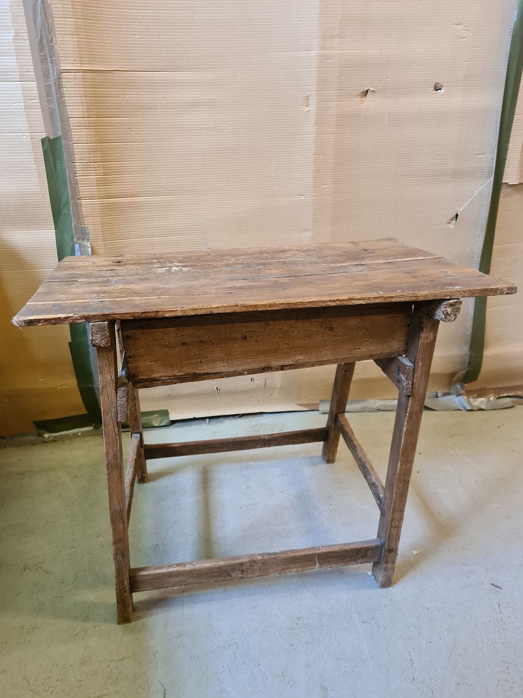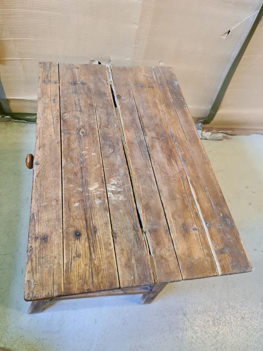 Bord med skuffe i massivt fyrretræ, fra 1880erne. Det har brugsspor. Højde 59cm Bredde 68cm Dybde 42cm Emne nummer: 75584