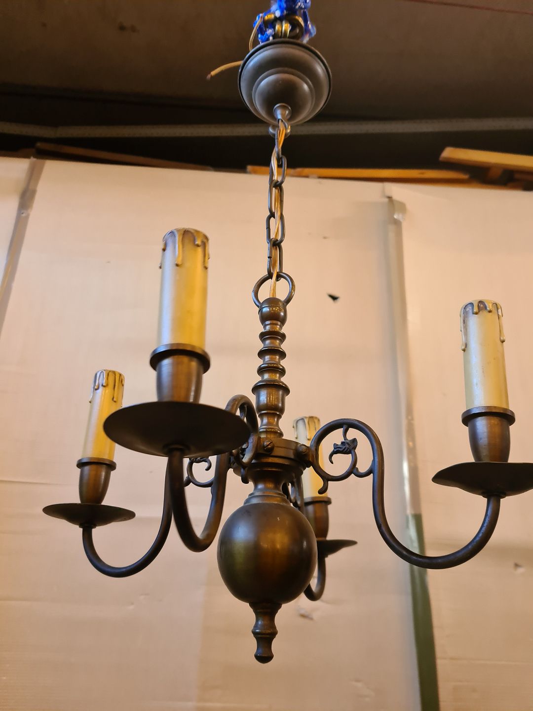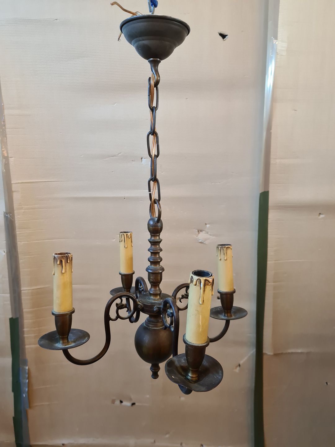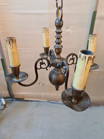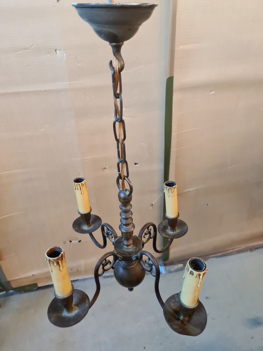 4-Armet kirkekrone i bruneret messing, fra 1930erne. Den har brugsspor og et par buler. Højde med kæde 57cm Diameter 40cm Emne nummer: 75609