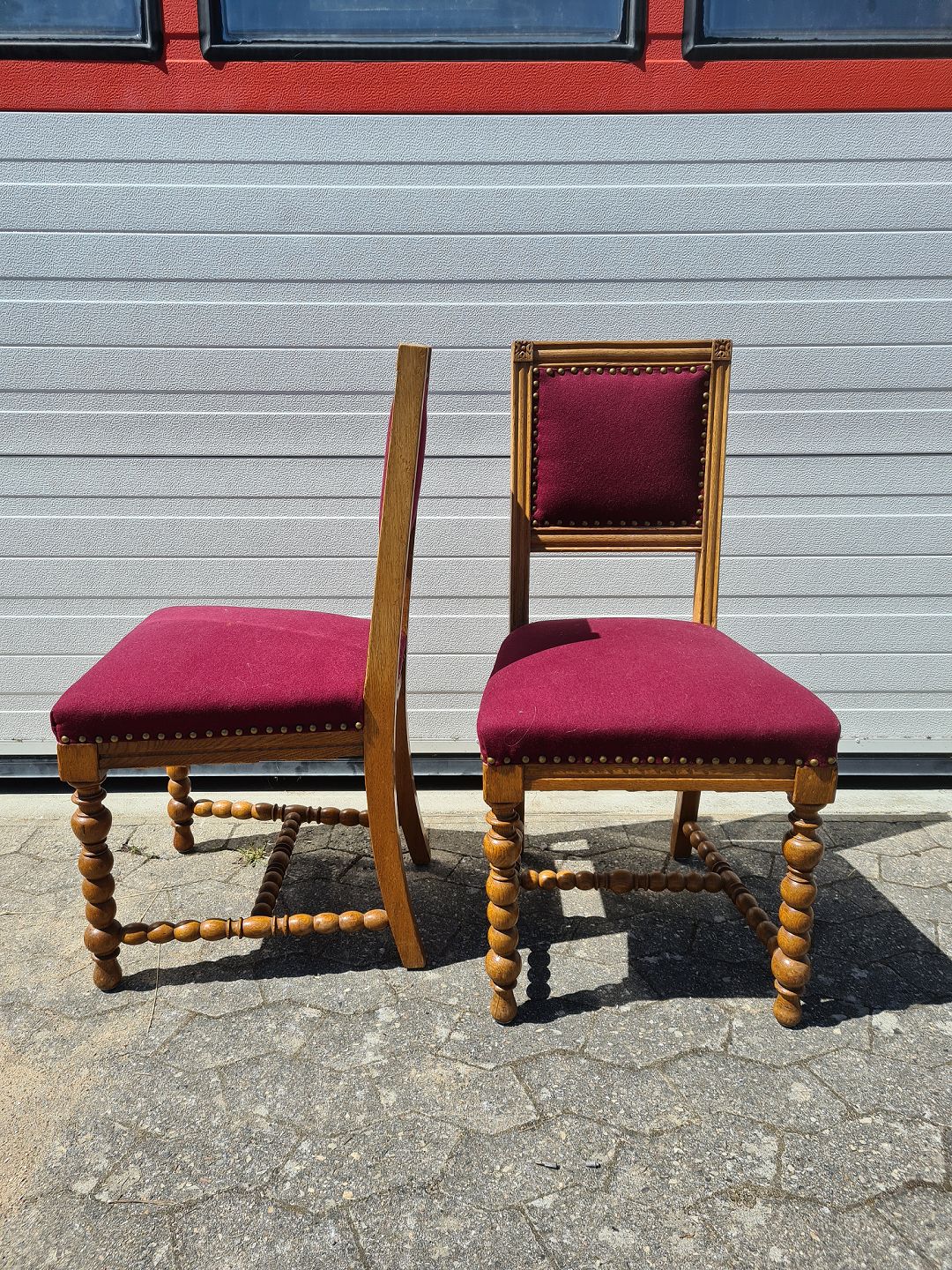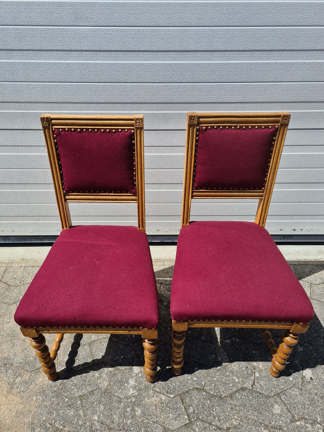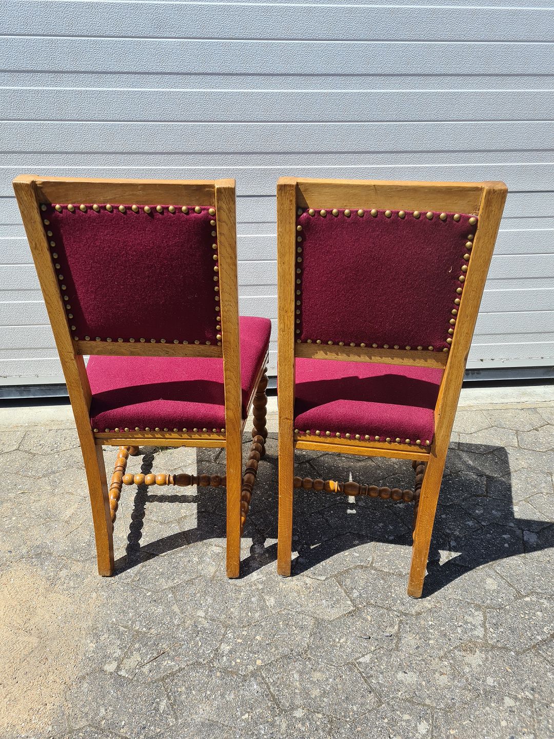 2 Stole i massivt egetræ, fra 1930erne. De har små brugsspor. Ryghøjde 88cm Sædehøjde 45cm Emne nummer: 75642