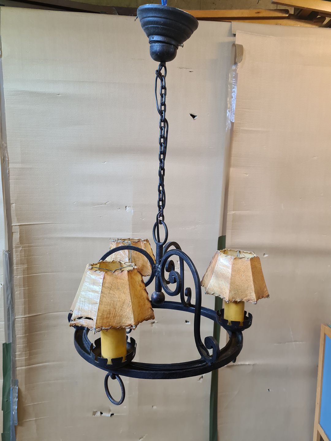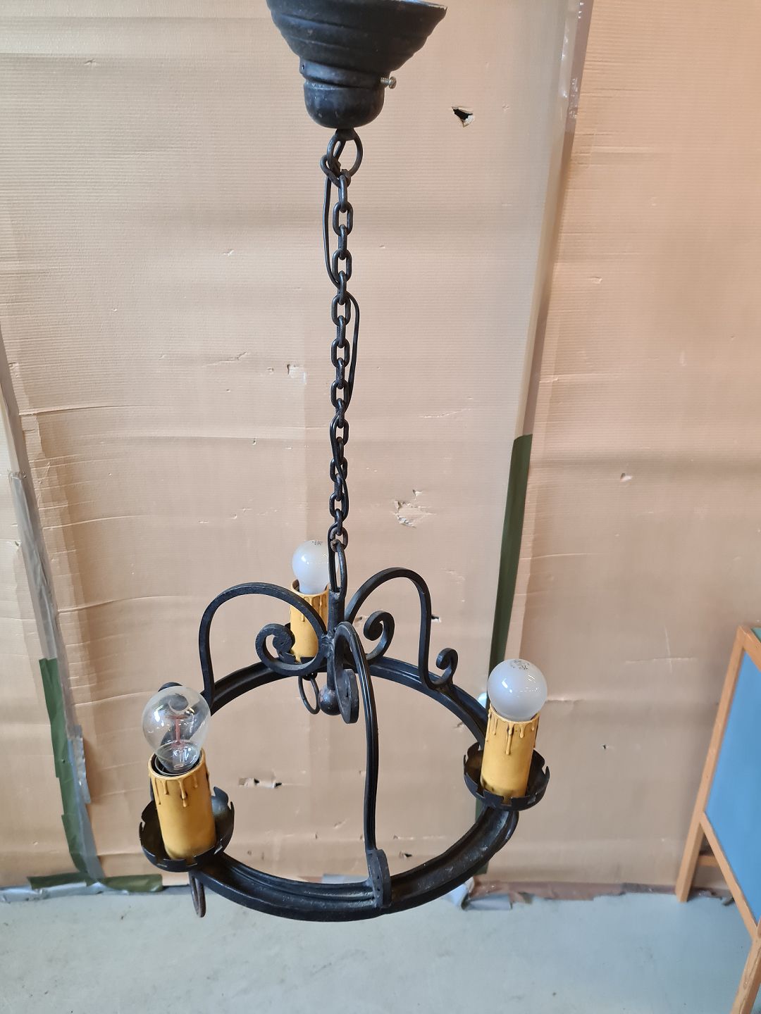 Loftlampe i smedejern, fra 1910erne. Den har brugsspor og skærmene har defekter. Højde 82cm Diameter 47cm Emne nummer: 75656
