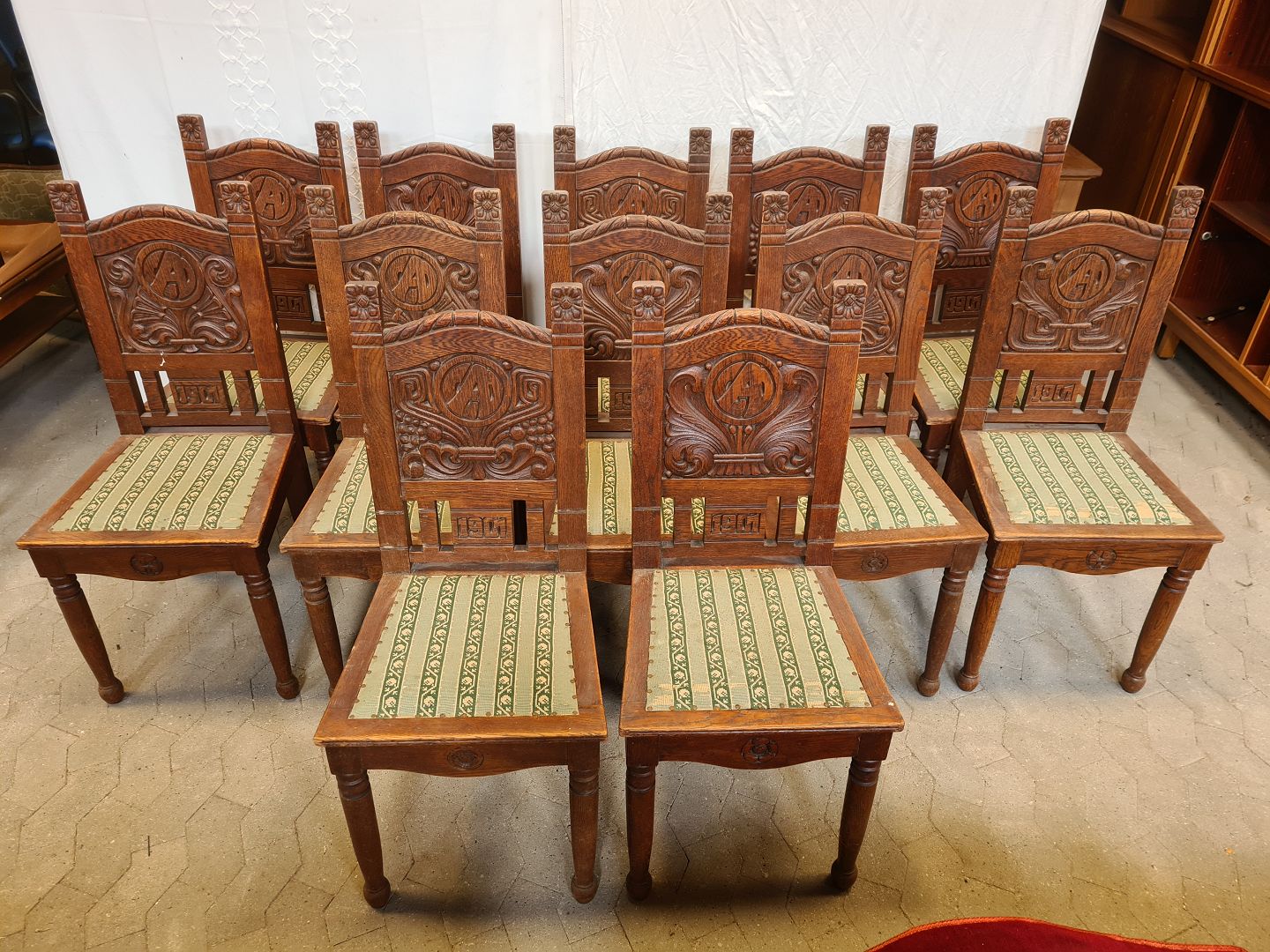 12 Robuste stole i massivt egetræ, fra 1900erne. De har brugsspor. Ryghøjde 102cm Sædehøjde 47cm Emne nummer: 90748