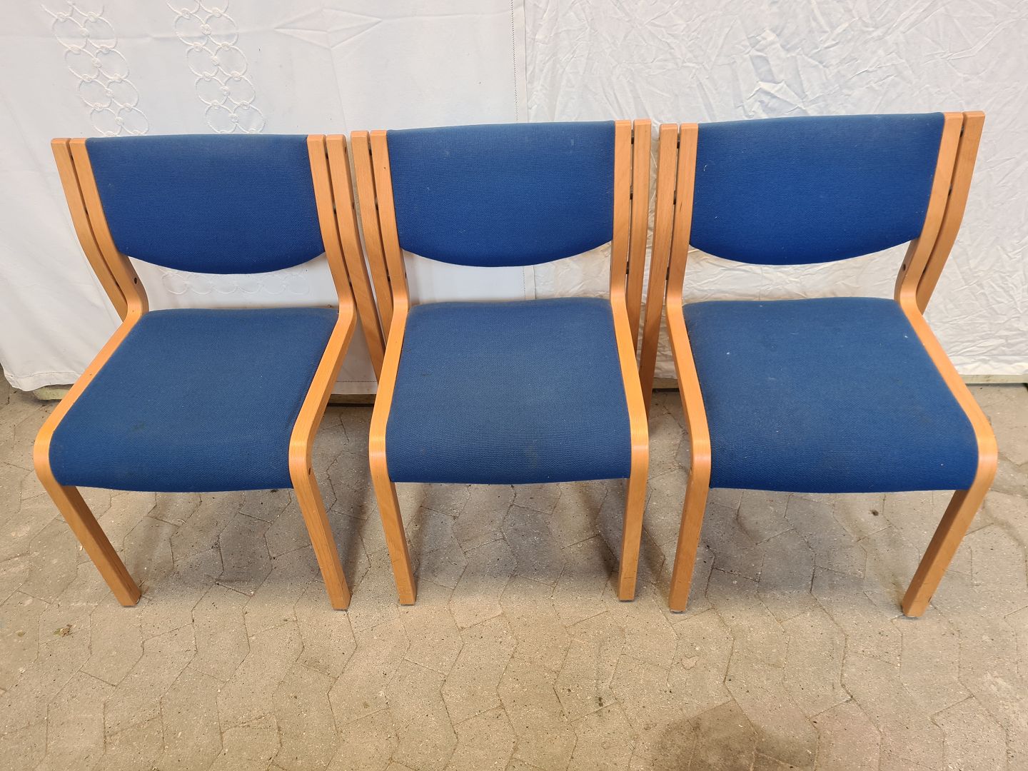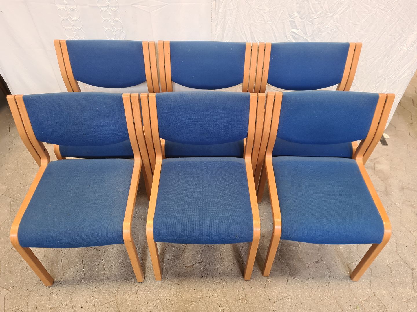 6 Stabelstole i bøgetræ, fra 1990erne. De har brugsspor og betrækket er beskidt. Ryghøjde 78cm Sædehøjde 45cm Emne nummer: 90752