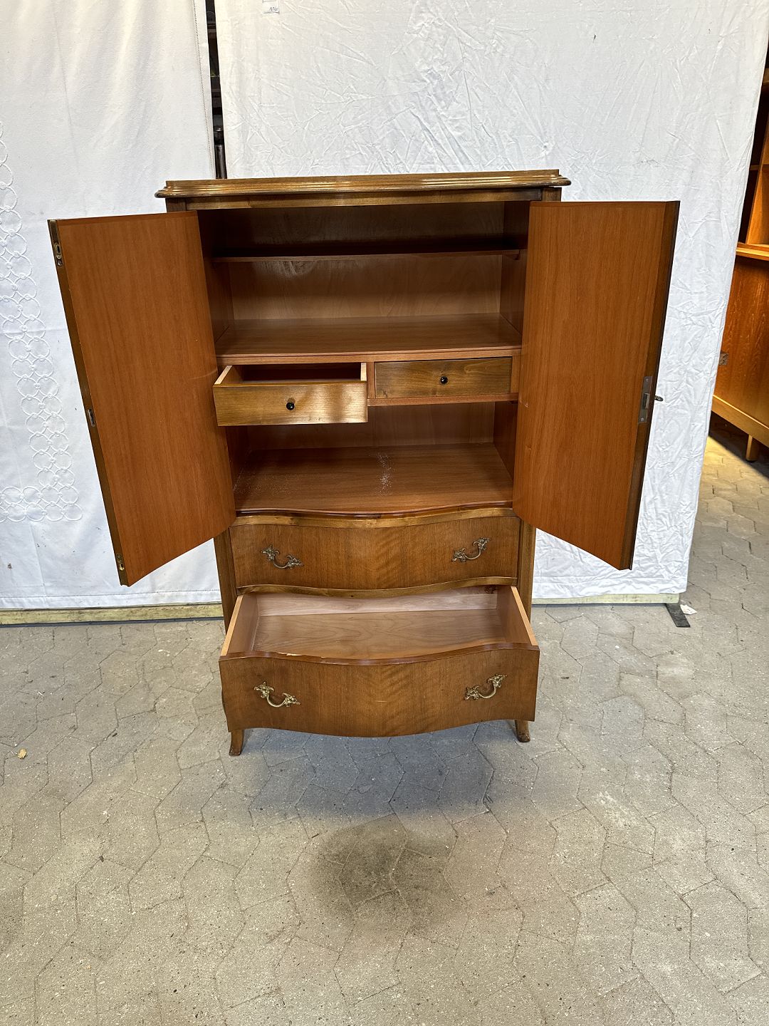 Dækketøjsskab i fineret nøddetræ, fra 1950'erne. Det har brugsspor. Højde 128 cm. Bredde 75 cm. Dybde 48 cm. Emne nummer: 90777