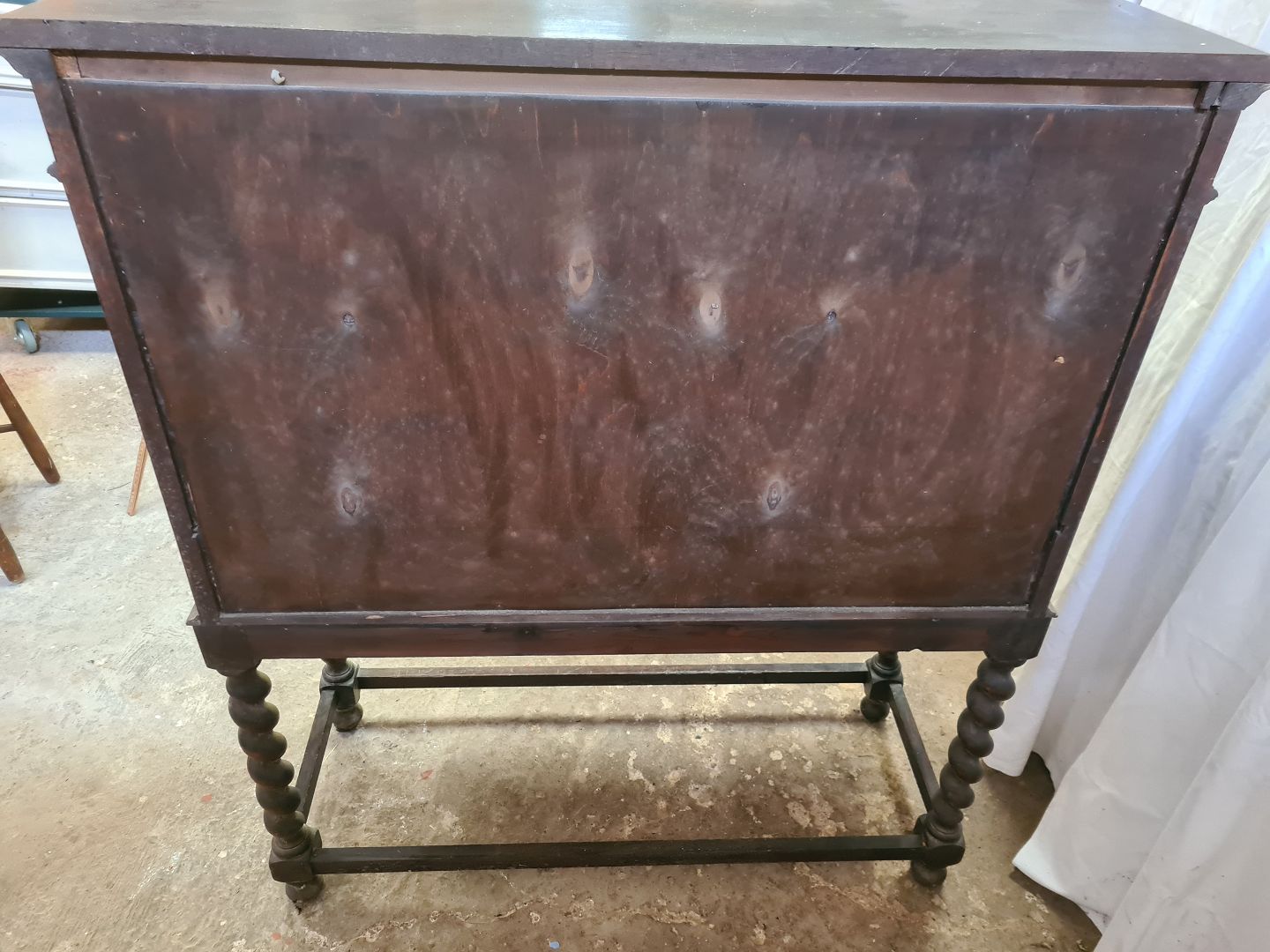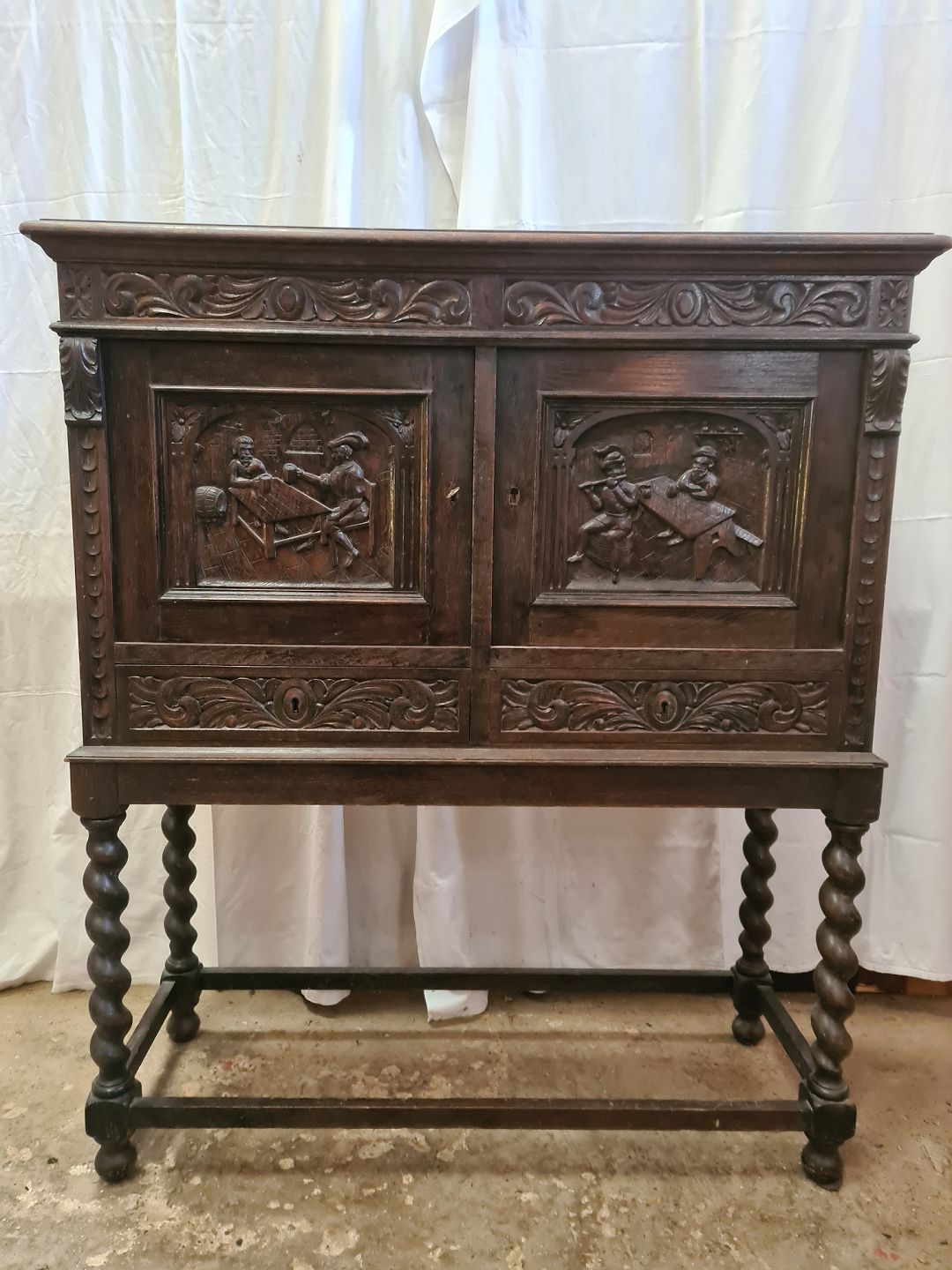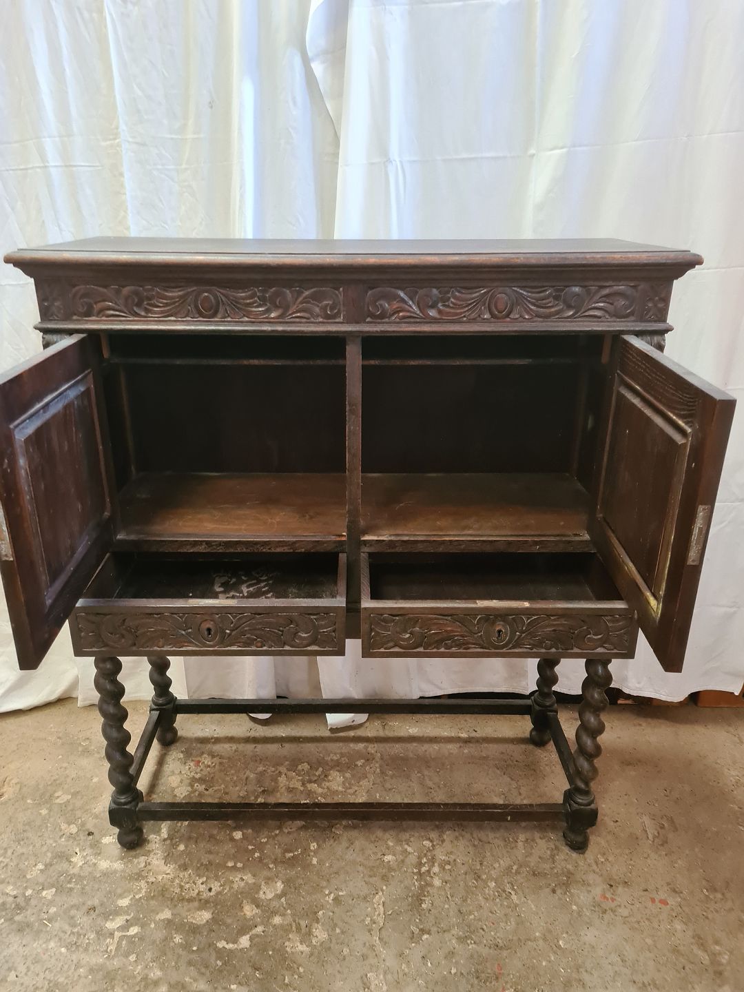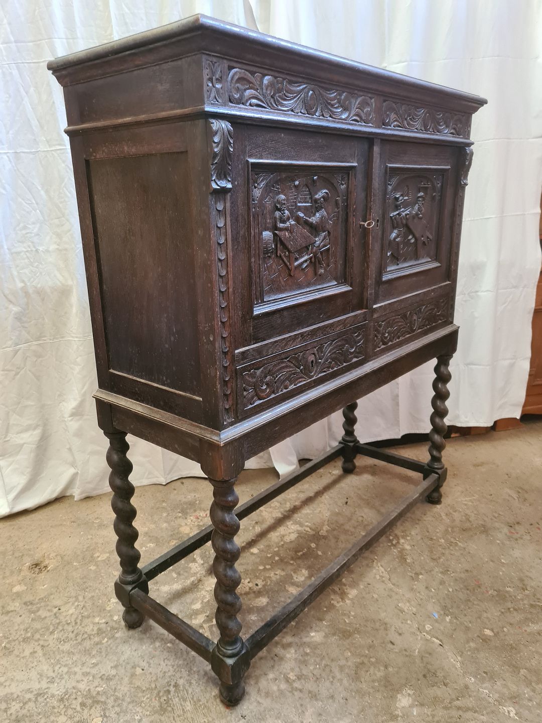 Skab i fineret og massivt egetræ, fra 1930erne. Det har brugsspor. Højde 127cm Bredde 110cm Dybde 41cm Emne nummer: 90833