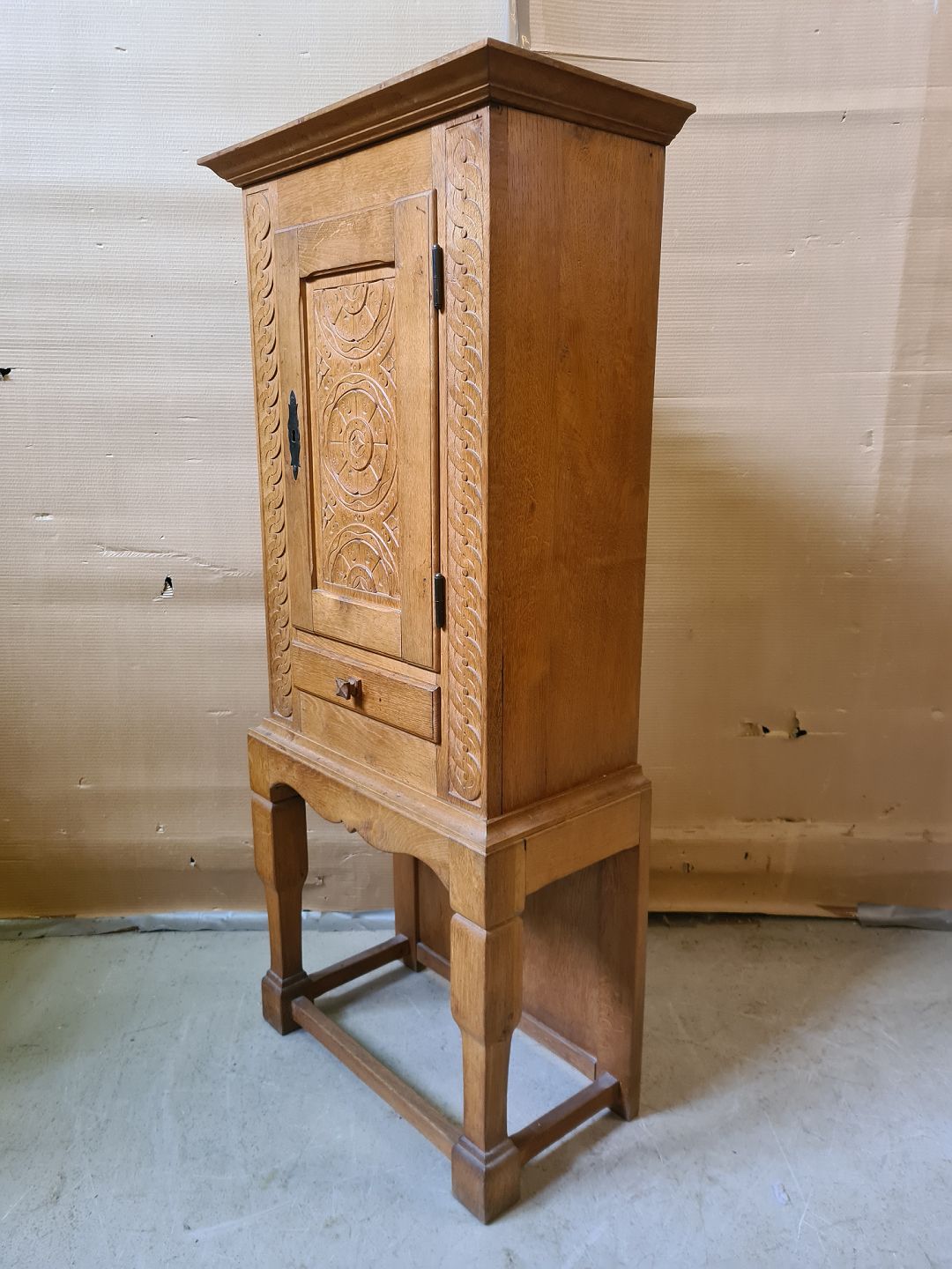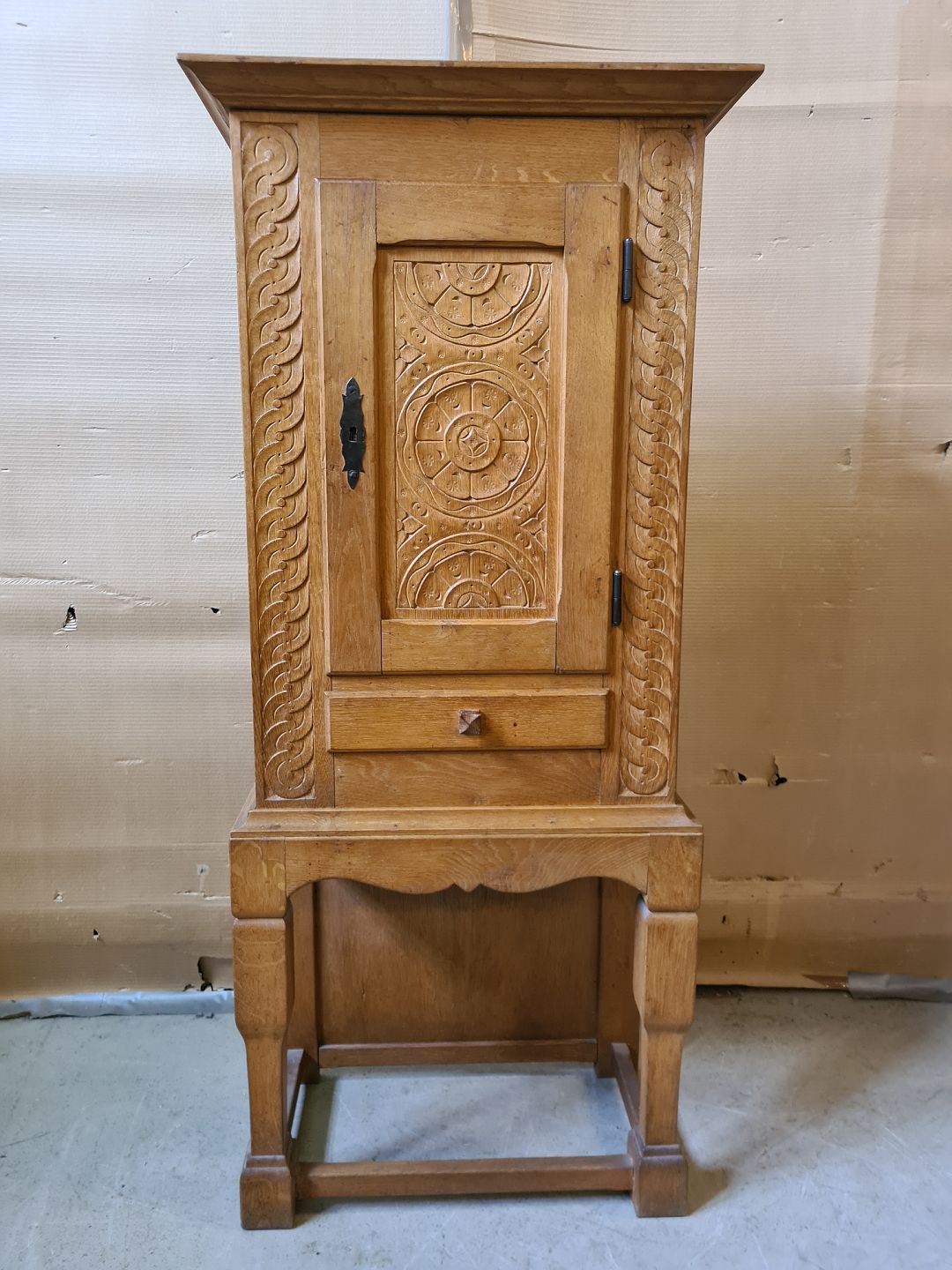 Skab i massivt egetræ, fra 1930erne. Det har brugsspor. Højde 121cm Bredde 53cm Dybde 29cm Emne nummer: 75781