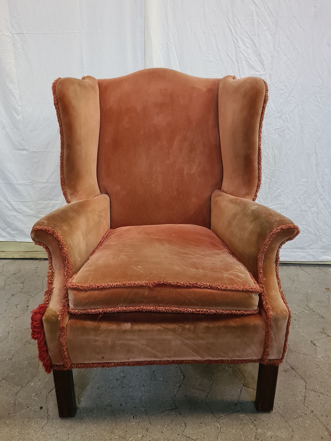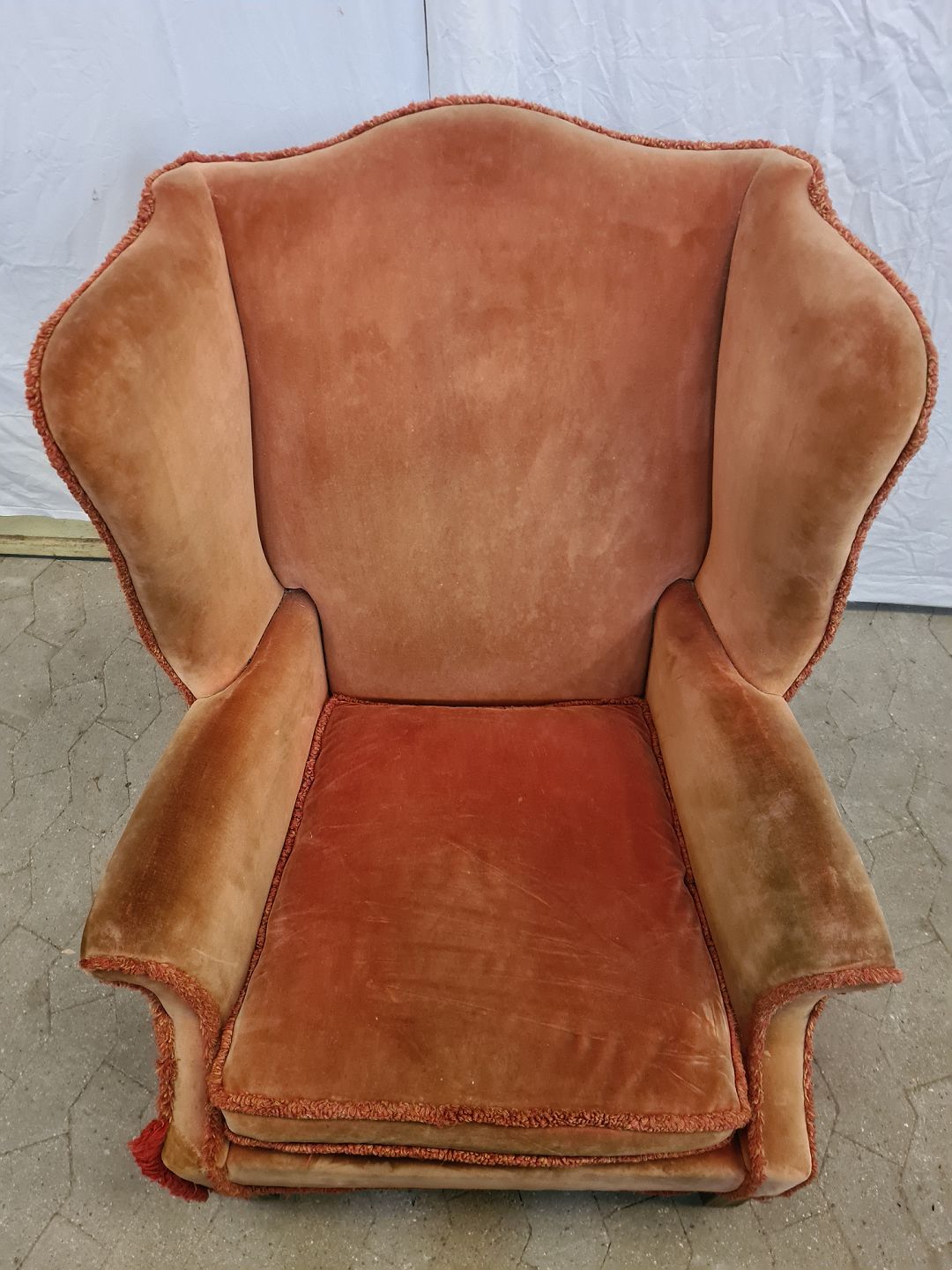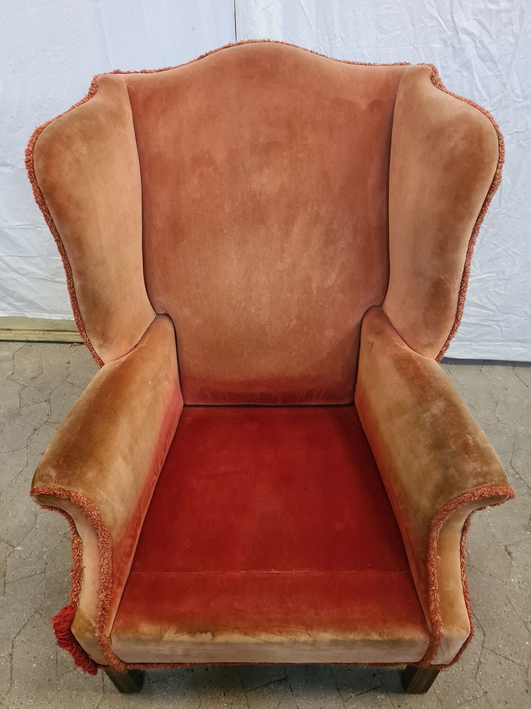 Lænestol i velour, fra 1950erne. Farven er falmet og den har brugsspor. Ryghøjde 106cm Bredde 75cm Dybde 78cm Sædehøjde 45cm Emne nummer: 90850