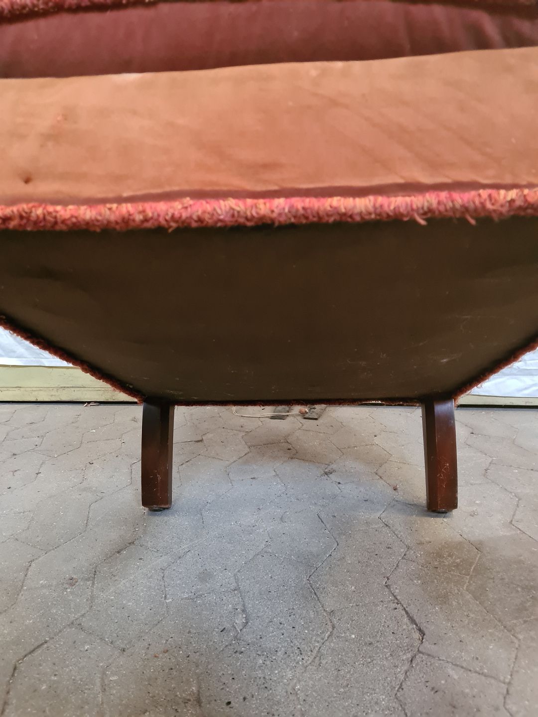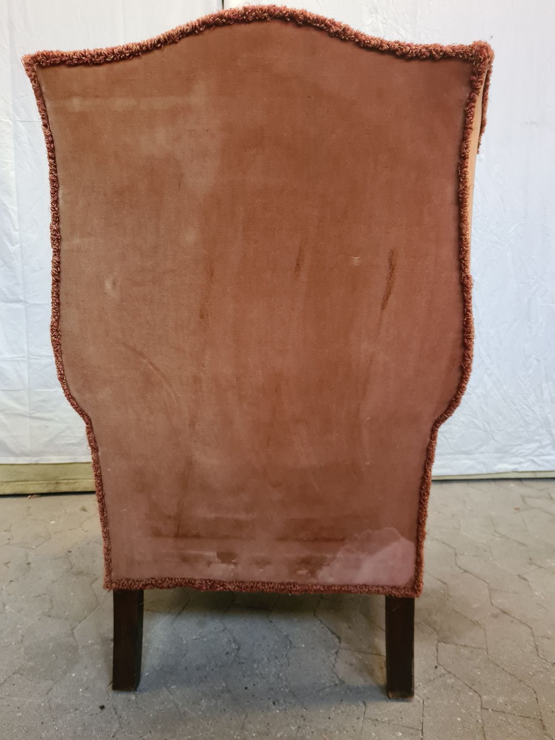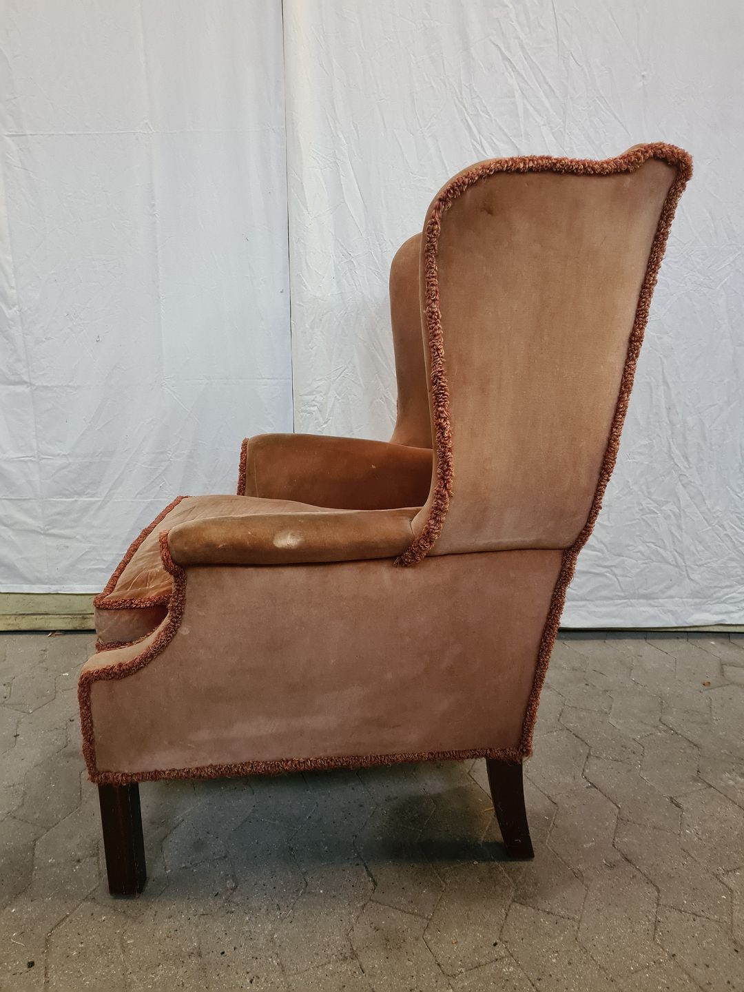 Lænestol i velour, fra 1950erne. Farven er falmet og den har brugsspor. Ryghøjde 106cm Bredde 75cm Dybde 78cm Sædehøjde 45cm Emne nummer: 90850