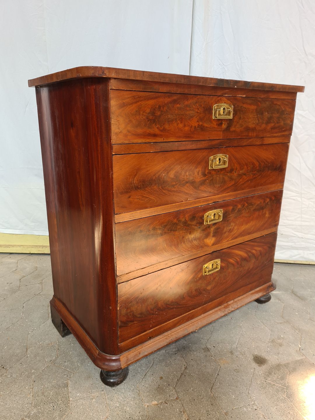 Kommode i fineret mahogni, fra 1910erne. Den har brugsspor og defekt finer. Højde 85cm Bredde 82cm Dybde 42cm Emne nummer: 90915