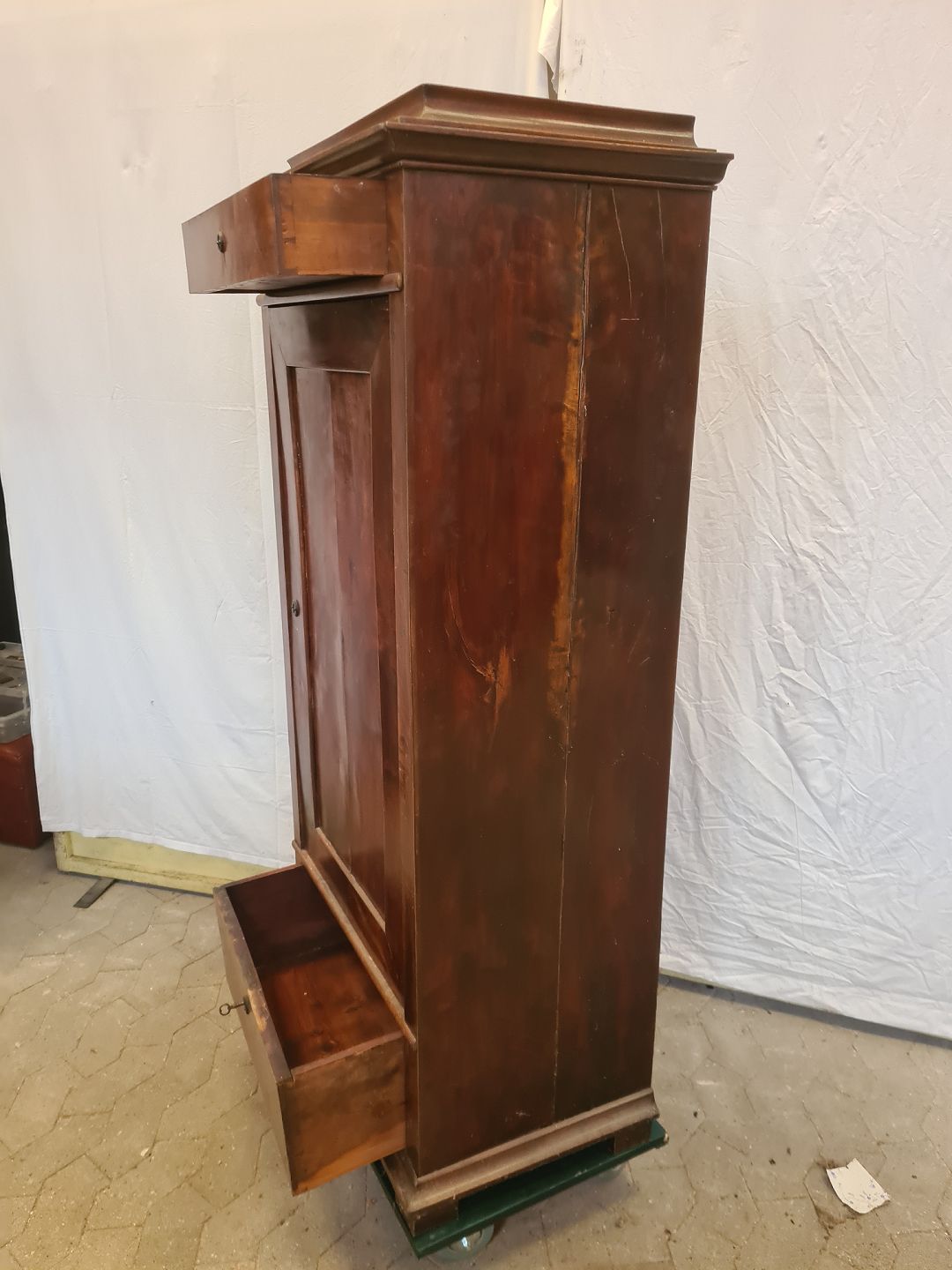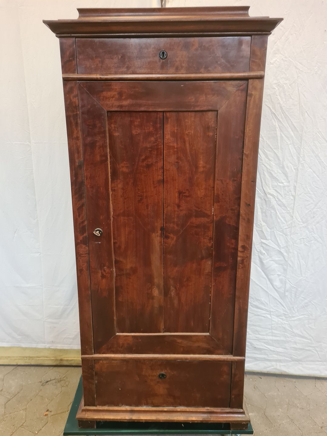 Skab i fineret mahogni, fra 1900erne. Det har brugsspor. Højde 151cm Bredde 71cm Dybde 45cm Emne nummer: 90956