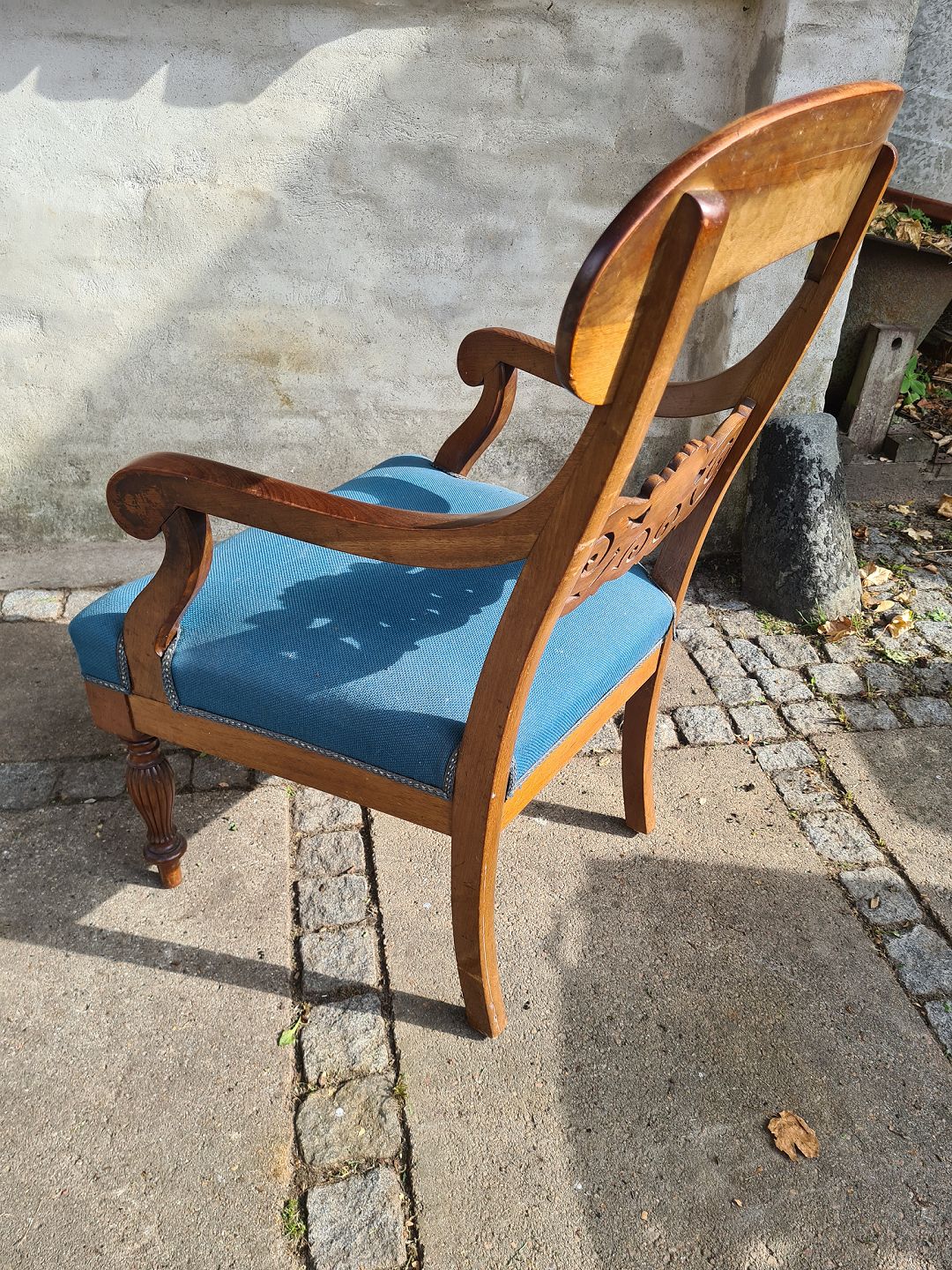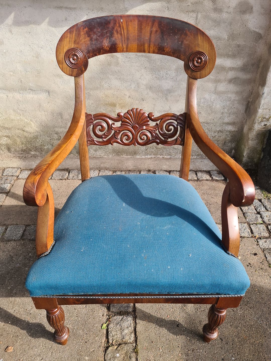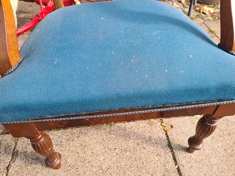 Armstol fra 1910´erne i mahogni. Fremstår pæn og udmærket stabil. Dog lettere tyndslidt på sædet med et løst kantbånd. (billede) Højde 95 cm. Bredde 59 cm. Dybde 64 cm. Sædehøjde 44 cm. Emne nummer: 80575