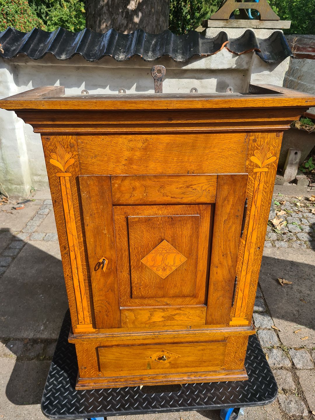 Antikt vægskab fra 1800 tallet i eg og med intarsia. Fremstår meget pænt og velholdt for alderen uden videre brugsspor. Alle skuffer bliver låst med lågen. Aldeles funktionsdygtigt. Højde 91 cm. Bredde 65 cm. Dybde 32 cm. Emne nummer: 80582