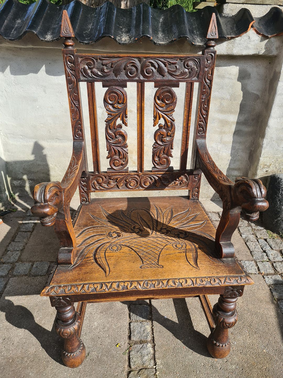 Kongearmstol fra 1920´erne i eg med udskæringer. Fremstår pæn og velholdt uden nævneværdige brugsspor. Højde 122 cm. Bredde 66 cm. Dybde 54 cm. Sædehøjde 45 cm Emne nummer: 80583