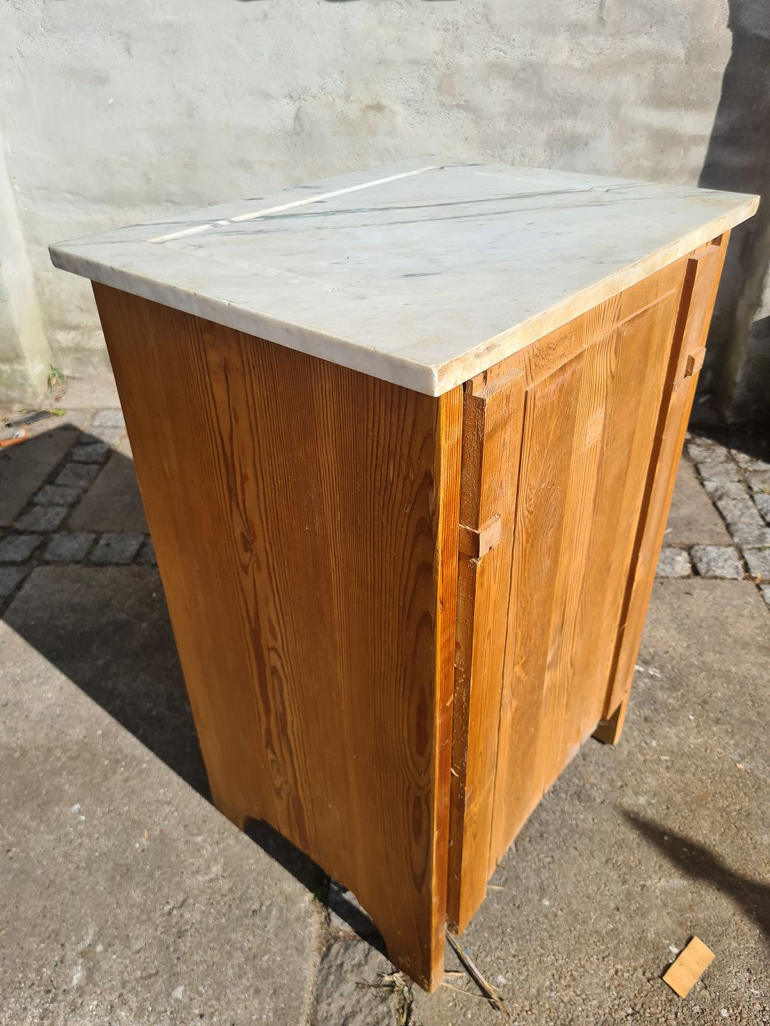 Servante fra 1920´erne i fyr og med mamor. Fremstår pæn, velholdt og funktionsdygtig. Dog med to huller øverst lige under mamorpladen i venstre side. (billede) Højde 76 cm. Bredde 50 cm. Dybde 40 cm. Emne nummer: 80584