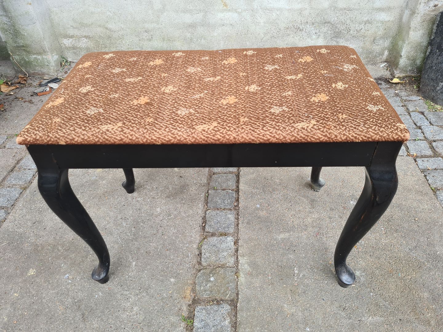 Sortmalet Klaverbænk fra 1940'erne med opbevaringsrum under sædet. Fremstår pæn og velholdt uden de store brugsspor.