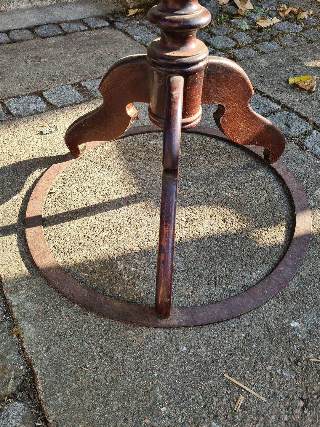 Højt lampebord fra 1940'erne i bejdset fyr. Fremstår med lettere overflade skrammer på pladen og en metal ring på foden for at sikre stabilitet.