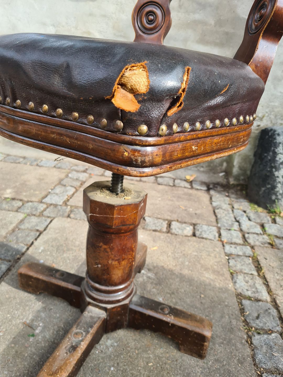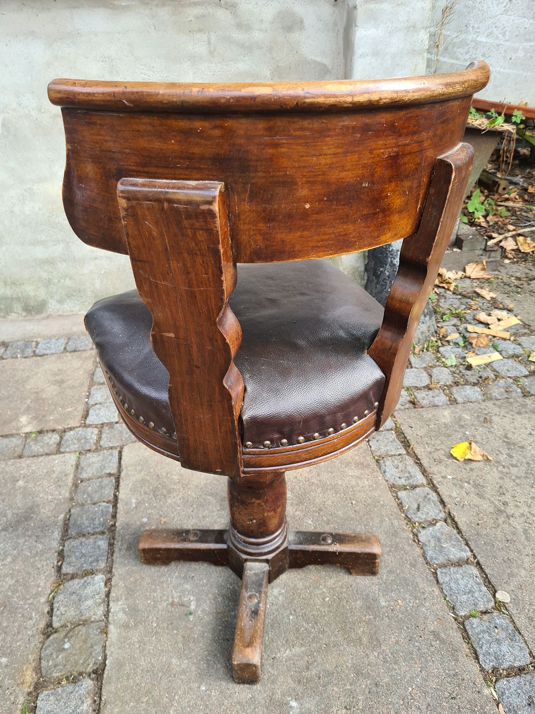 Gammel kontorstol fra 1930'erne I eg, på drejefod og med lædersæde. Fremstår pæn og stabil dog med læderskader på hjørnerne af sædet. (billede)