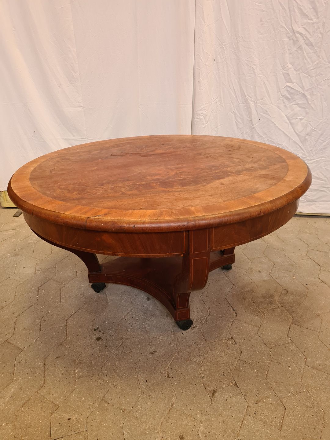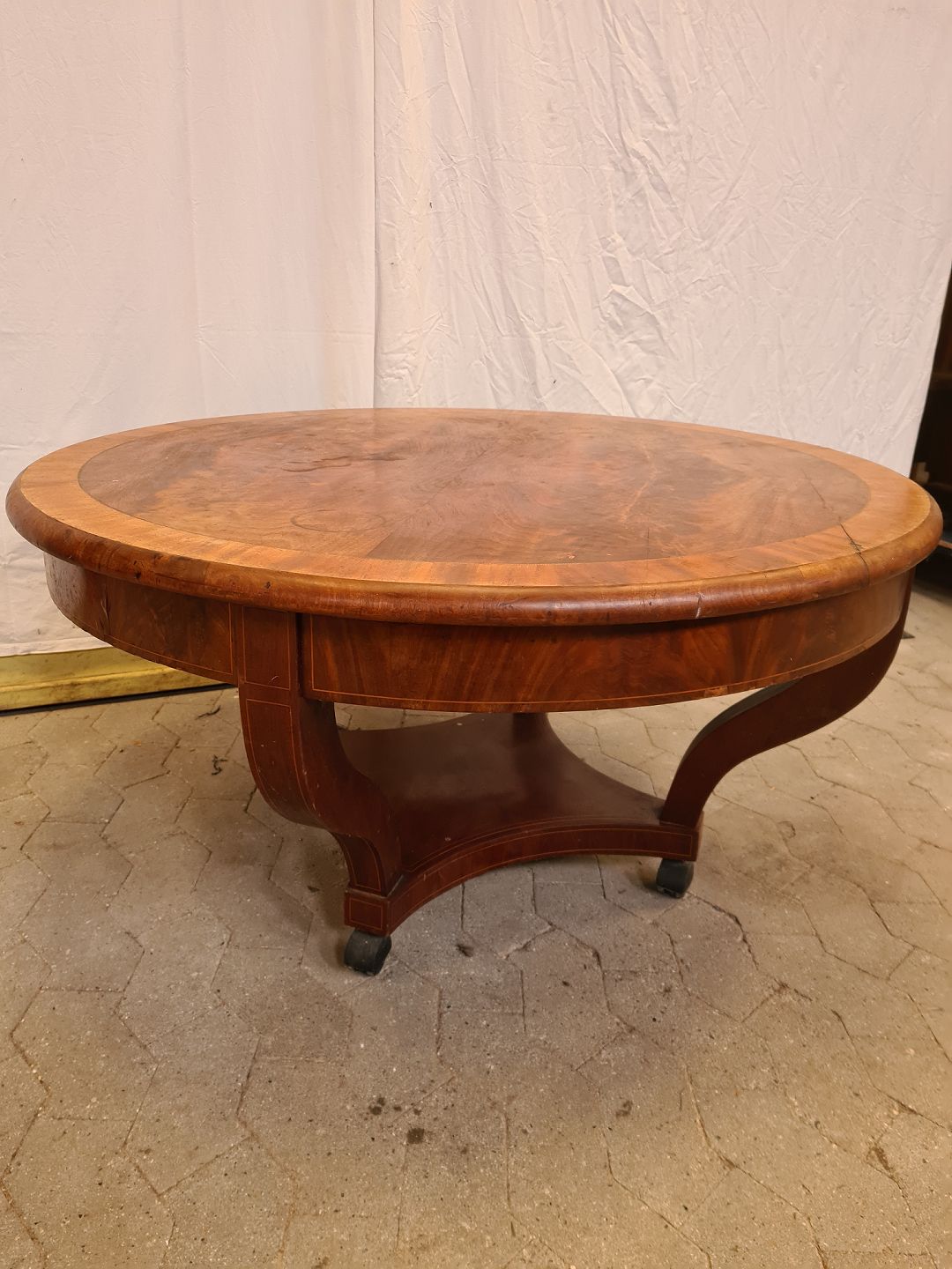 Sofabord i fineret mahogni, fra 1900erne. Det har brugsspor. Højde 56cm Diameter 110cm Emne nummer: 90986