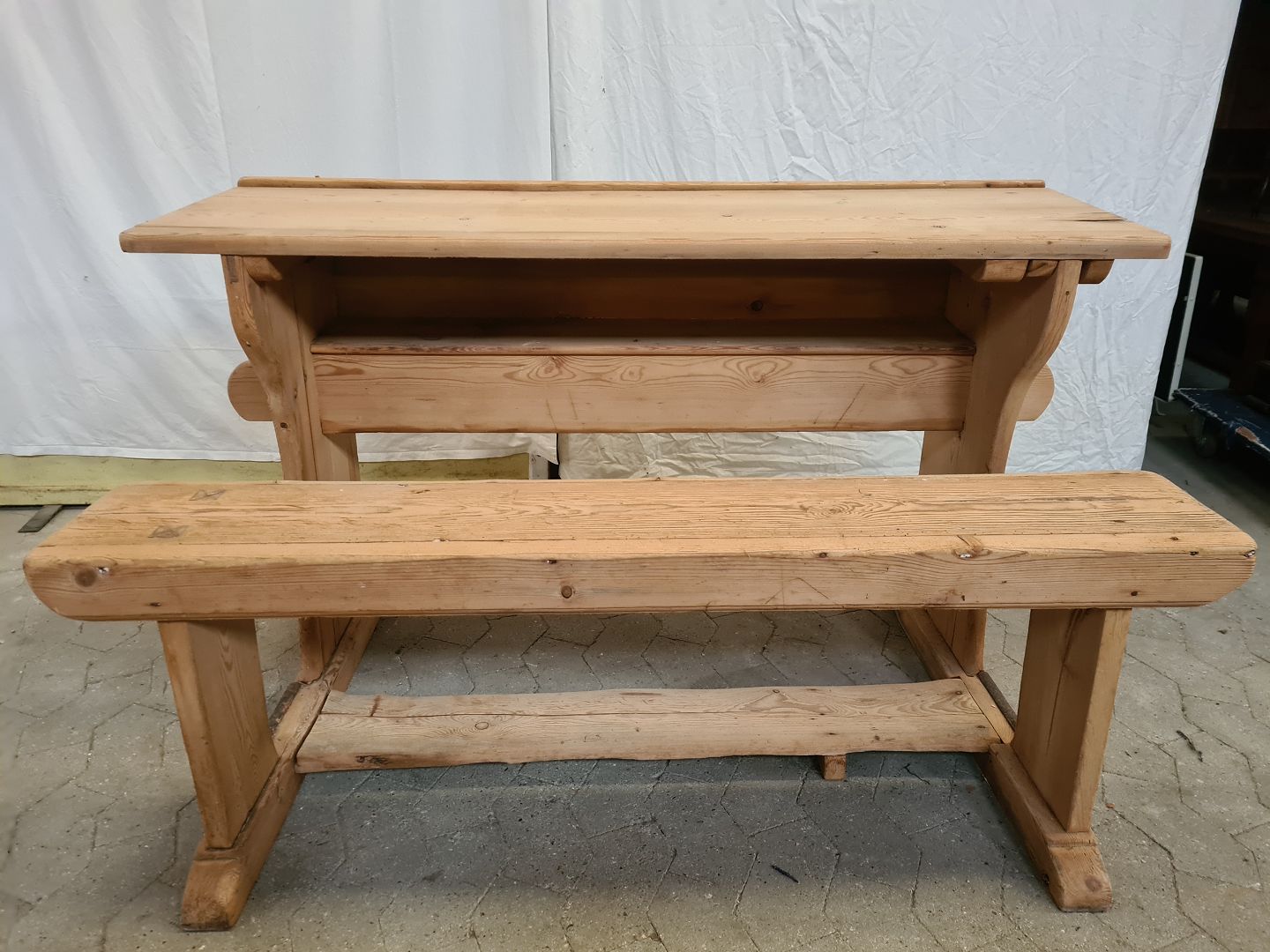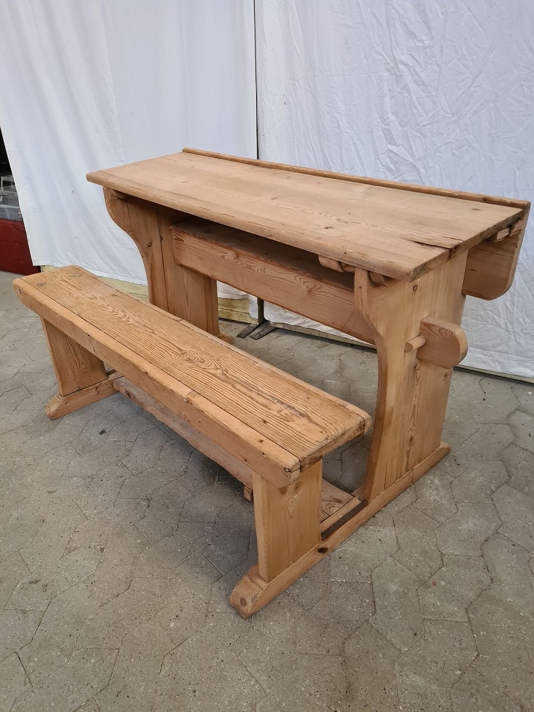 Gammelt skolebord i massivt fyrretræ, fra 1910erne. Det har patina. Højde 78cm Sædehøjde 46cm Bredde 126cm Dybde 72cm Emne nummer: 90988