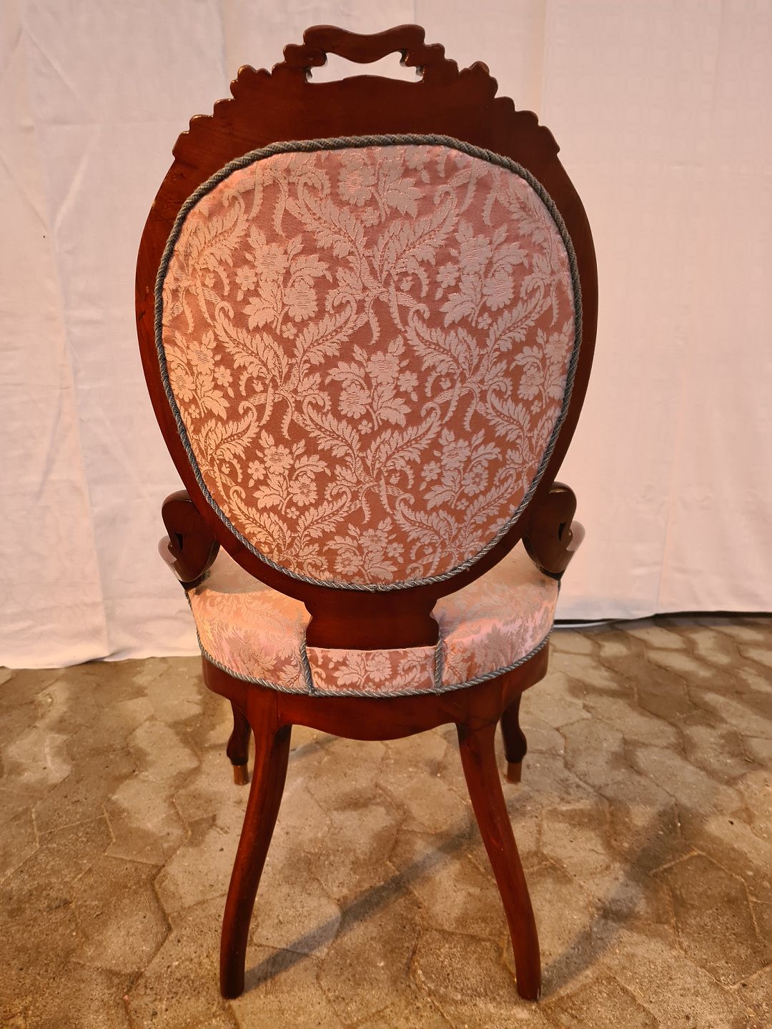 Salonstol i mahogni, fra 1900erne. Den har et skjold på sædet. Ryghøjde 94cm Sædehøjde 44cm Emne nummer: 91027