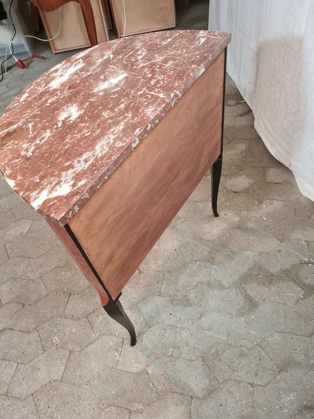 Kommode i fineret mahogni med intasia og marmorplade, fra 1980erne. Den har brugsspor og marmorpladen er defekt. Højde 76cm Bredde 64cm Dybde 37cm Emne nummer: 91121