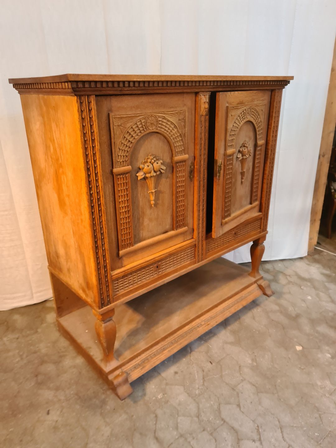 Skab i fineret egetræ, fra 1920erne. Det har brugsspor. Højde 146cm Bredde 142cm Dybde 60cm Emne nummer: 91128