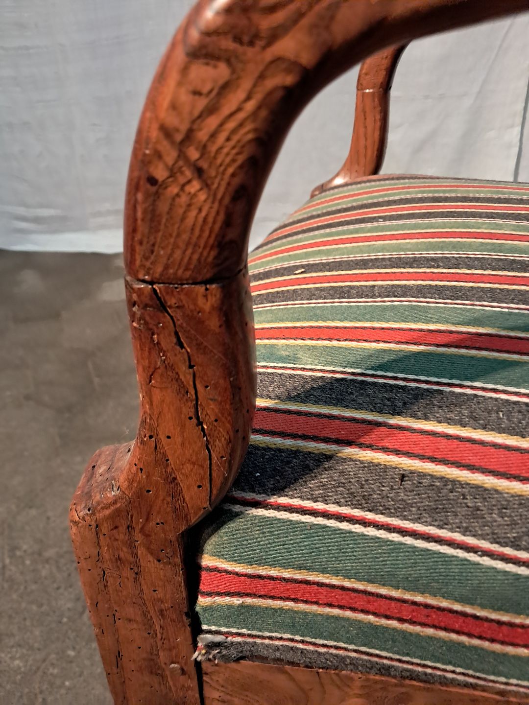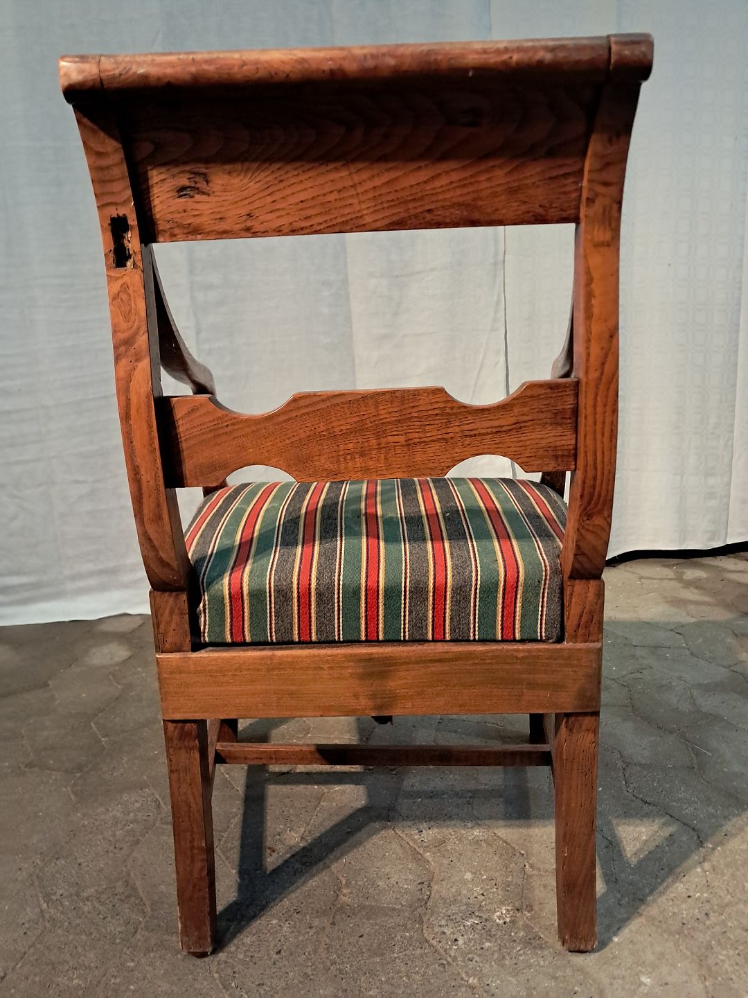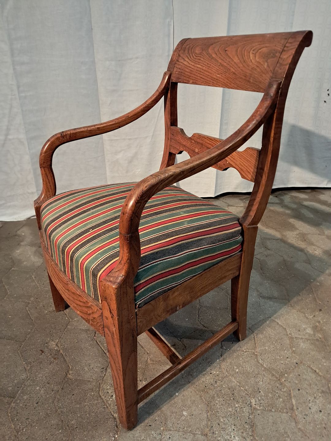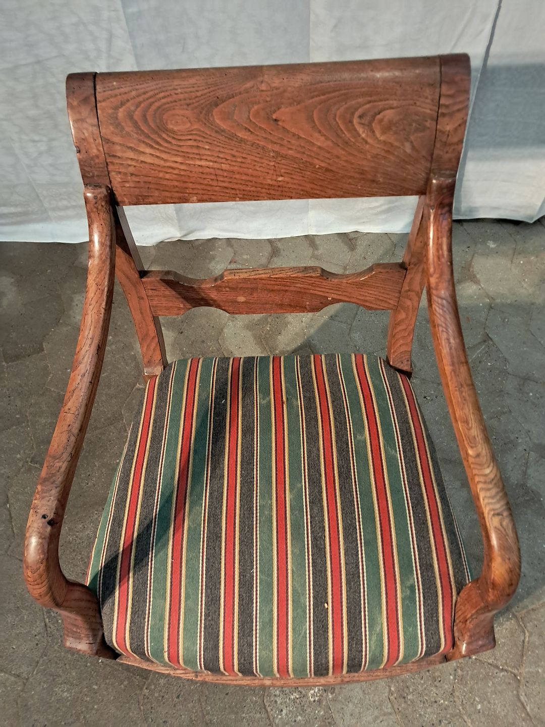 Armstol imassivt egetræ, fra 1900erne. Den har brugsspor og en defekt. (se foto) Ryghøjde 82cm Sædehøjde 39cm Emne nummer: 91193