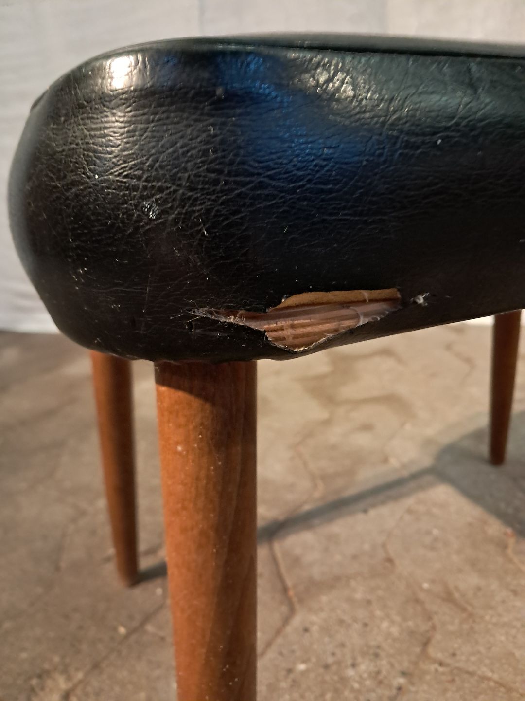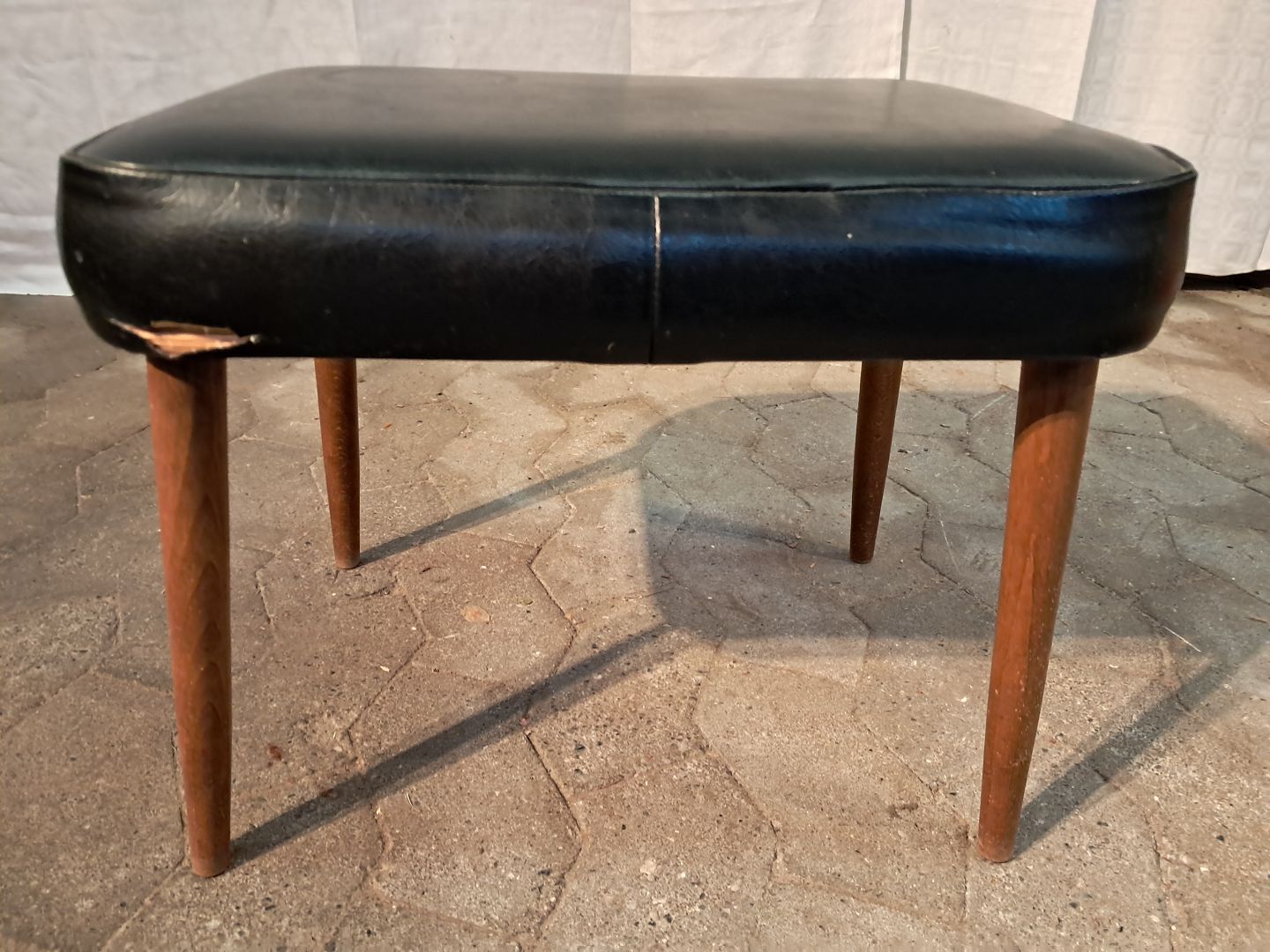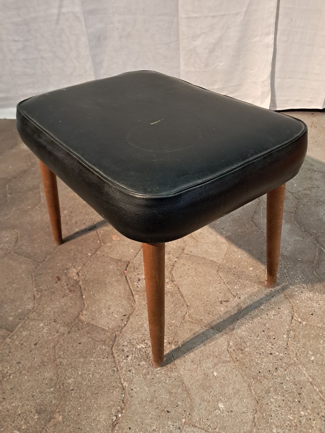 Skammel i bøgetræ og kunstlæder, fra 1960erne. Der er en revne i betrækket.(se foto) Højde 37cm Bredde 36cm Længde 48cm Emne nummer: 91197
