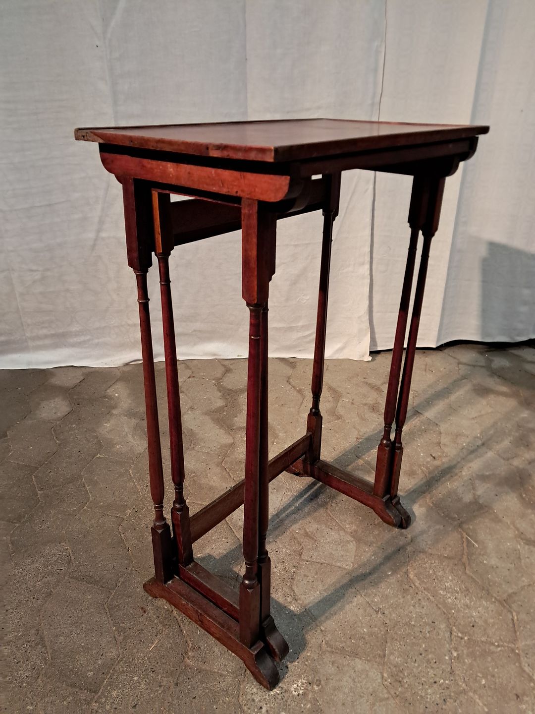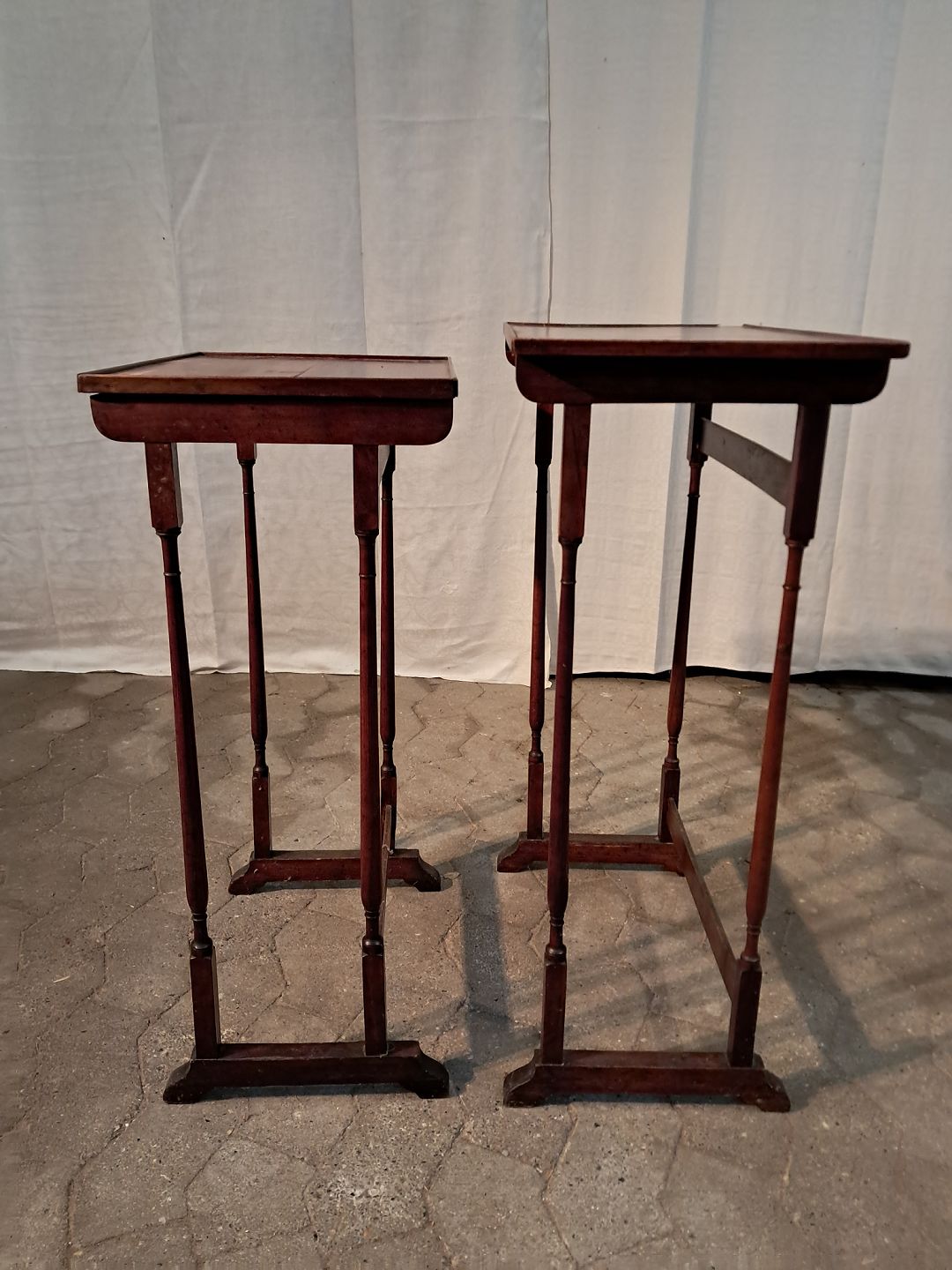2 Indskudsborde i fineret og massivt bøgetræ og mahogni, fra 1910erne. De har brugsspor og en defekt liste. Højde 76cm Bredde 52cm Dybde 30cm Emne nummer: 91203