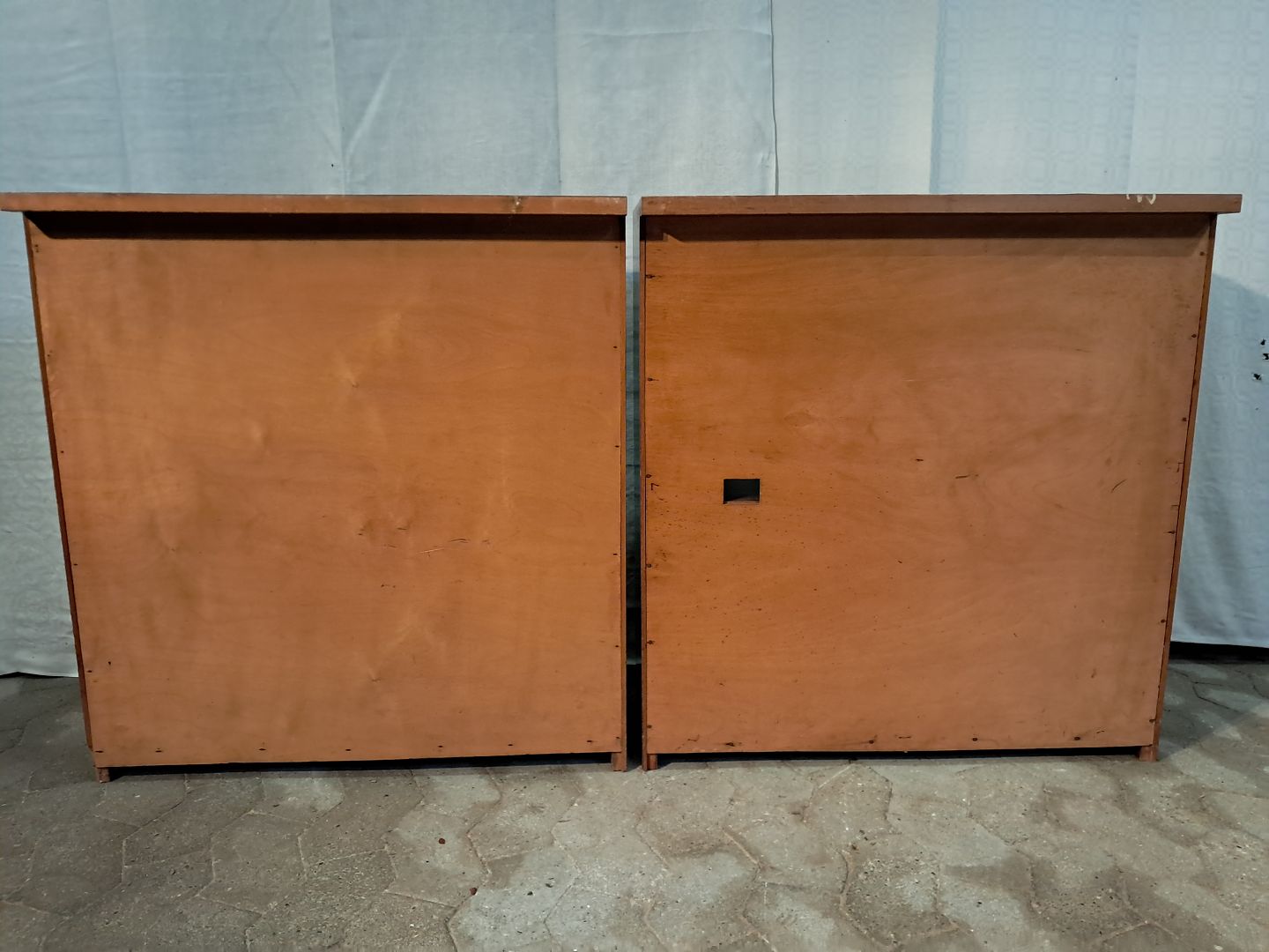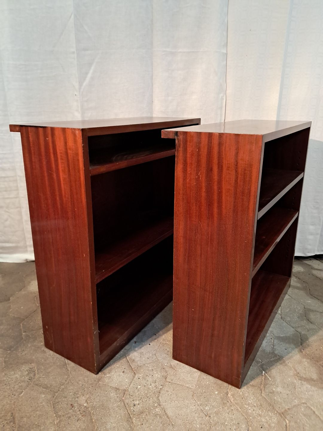 2 Reoler i fineret mahogni, fra 1950erne. De har brugsspor og defekter på siden.(se foto) Højde 80CM Bredde 75Cm Dybde 25cm Dybde i toppen 30cm Emne nummer: 91210