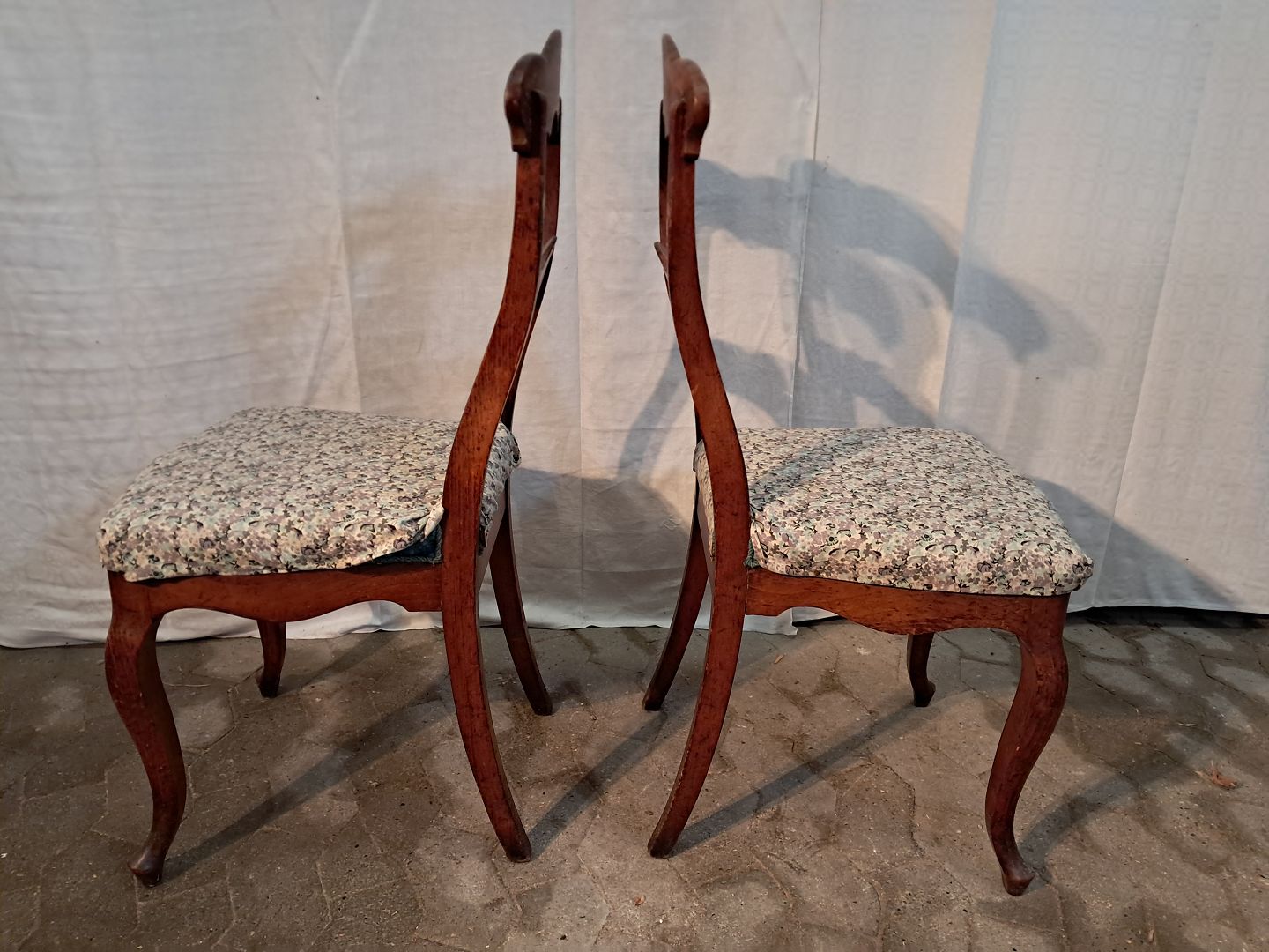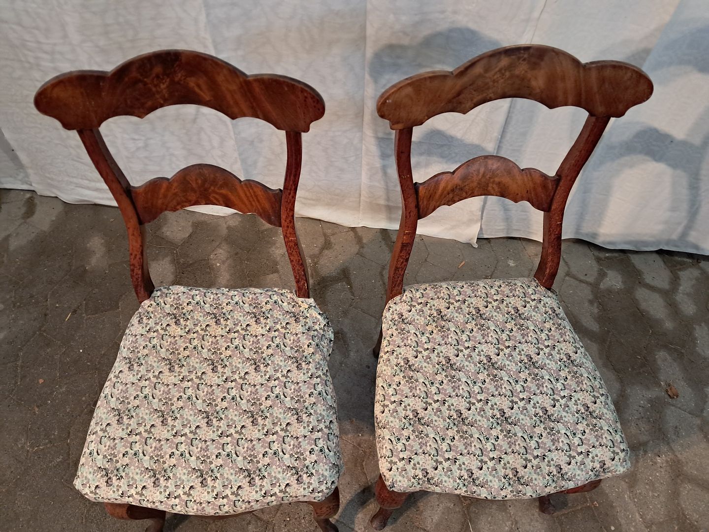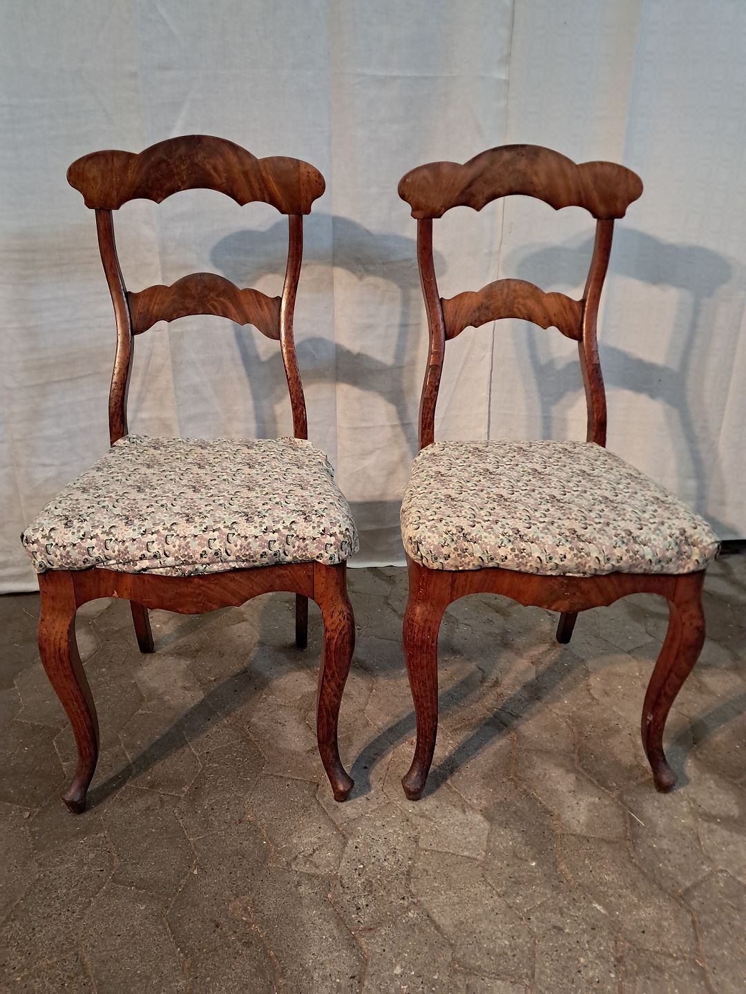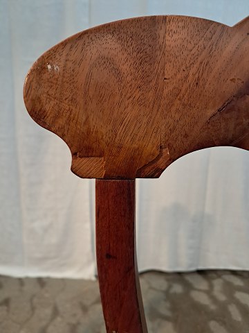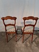 2 Salonstole i fineret mahogni og massivt bøgetræ, fra 1900erne. De har brugsspor og en finer defekt. Ryghøjde 94cm Sædehøjde 47cm Emne nummer: 91259