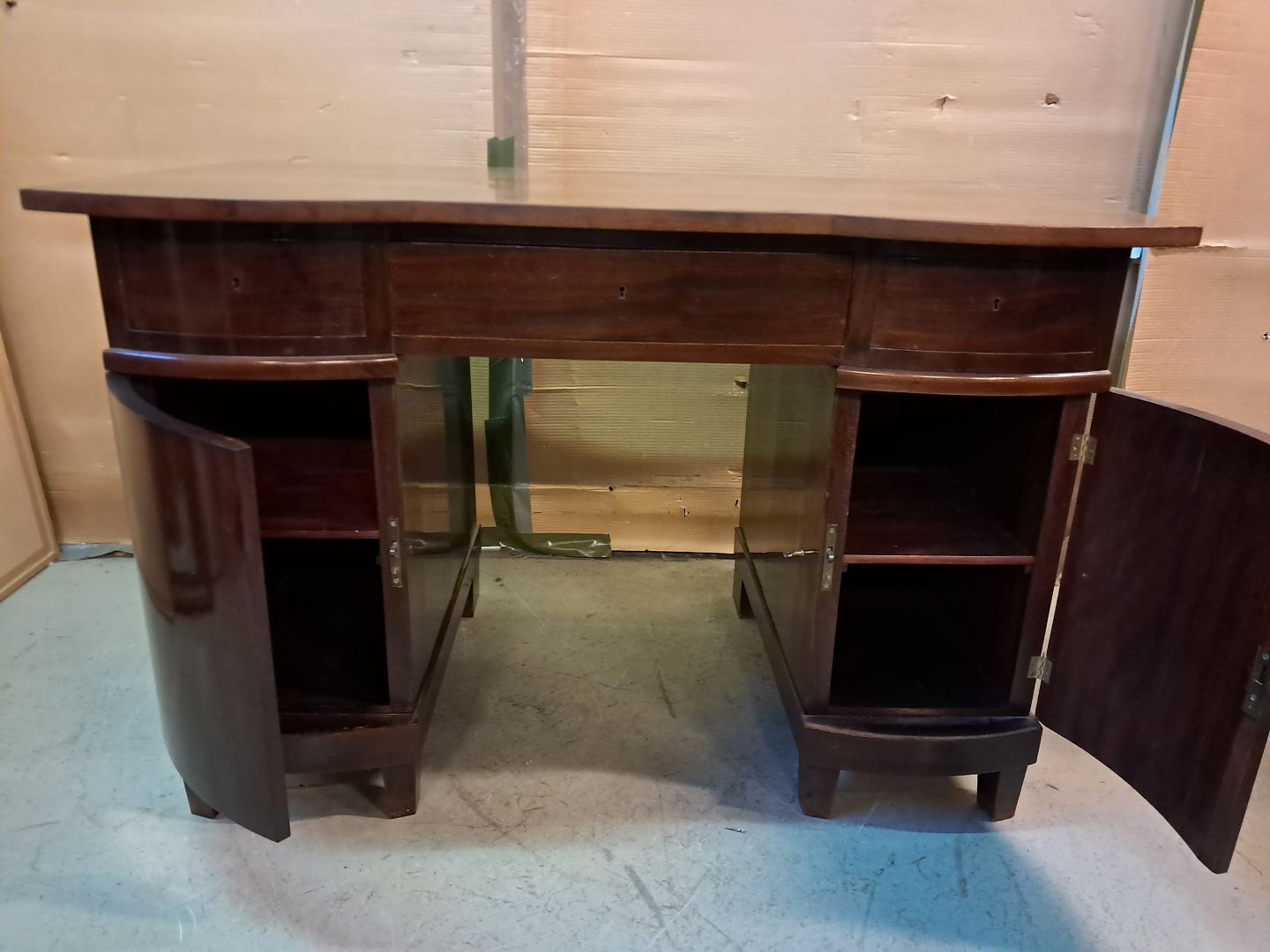 Skrivebord i fineret mahogni, fra 1910erne. Det har brugsspor. Højde 75cm Højde fra gulv til underkant 59cm Bredde 115cm Dybde 70cm Emne nummer: 76032