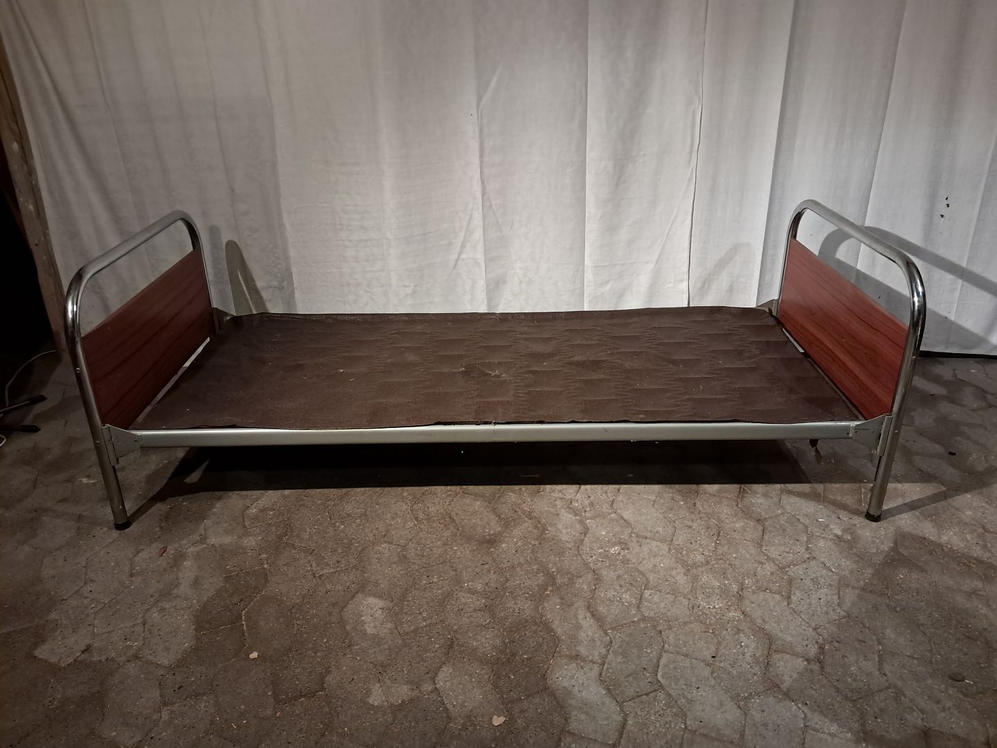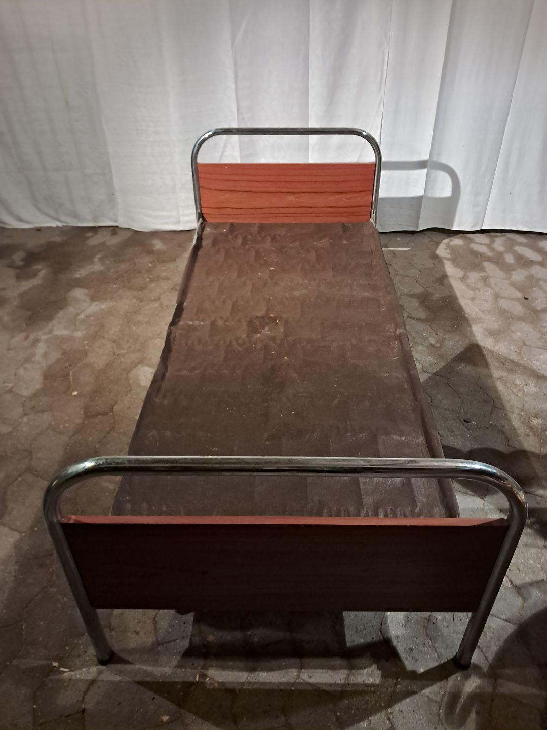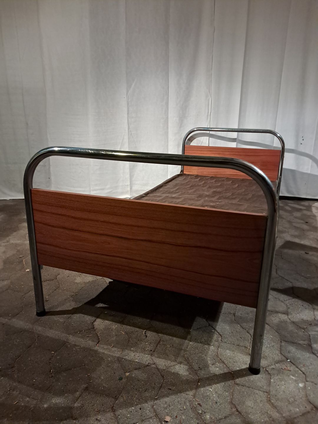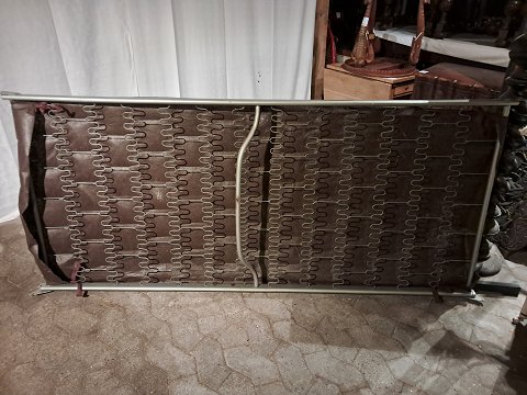 Seng i metal og fineret teaktræ, fra 1950erne. Den har brugsspor og der medfølger ikke madras. Højde 66cm Bredde 85cm Længde 196cm Madras mål : 190cm X 77cm Emne nummer: 91277
