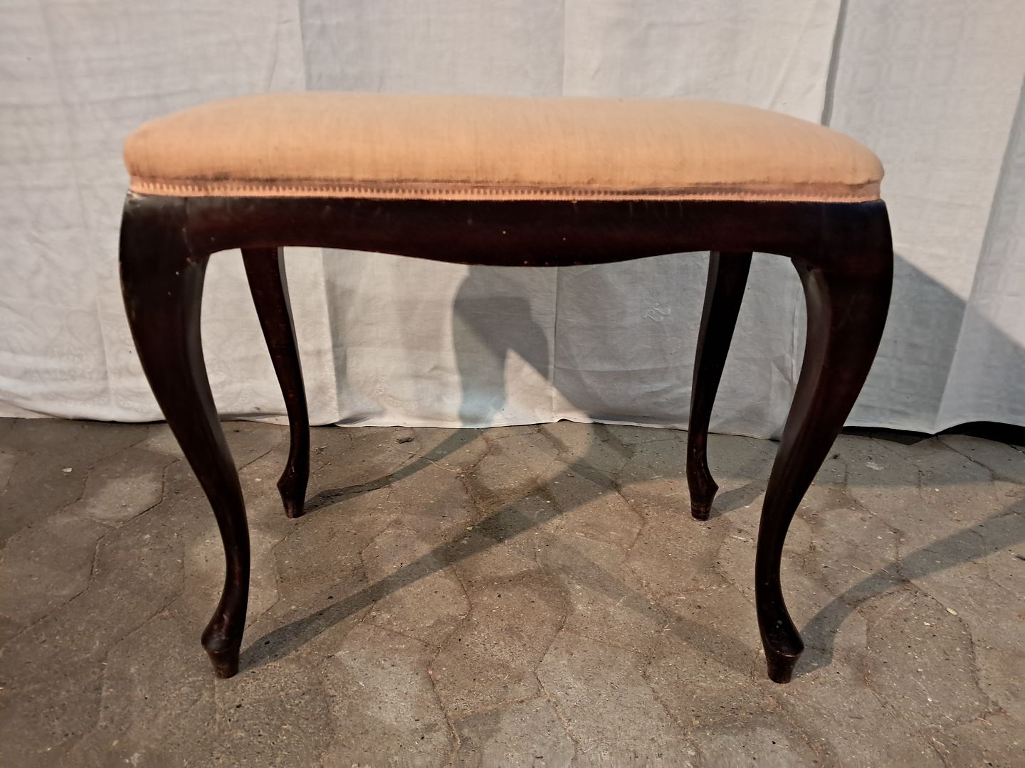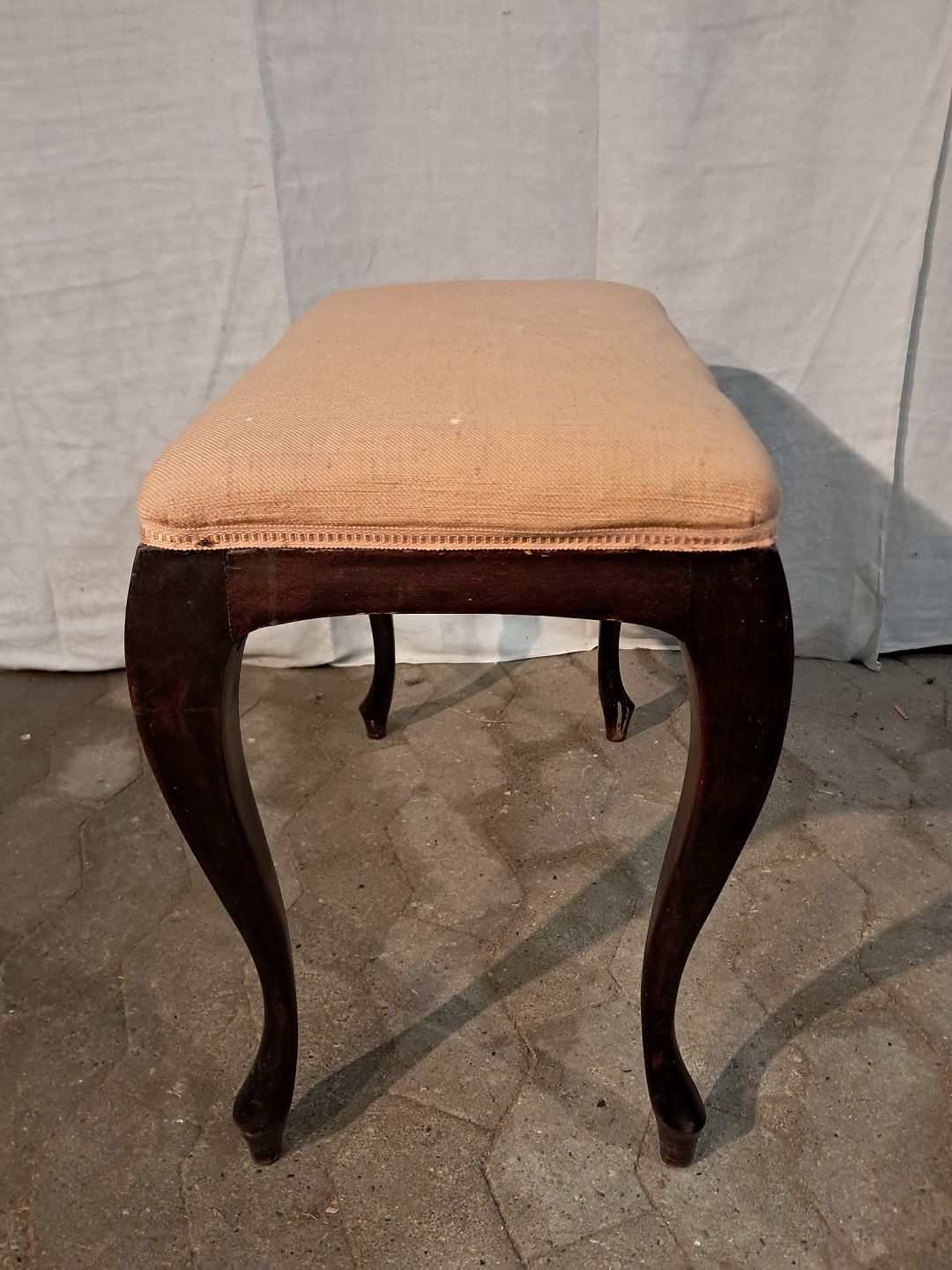 Skammel i massivt bøgetræ, fra 1920erne. Den har brugsspor på betrækket. Højde 52cm Bredde 35cm Længde 59cm Emne nummer: 91331