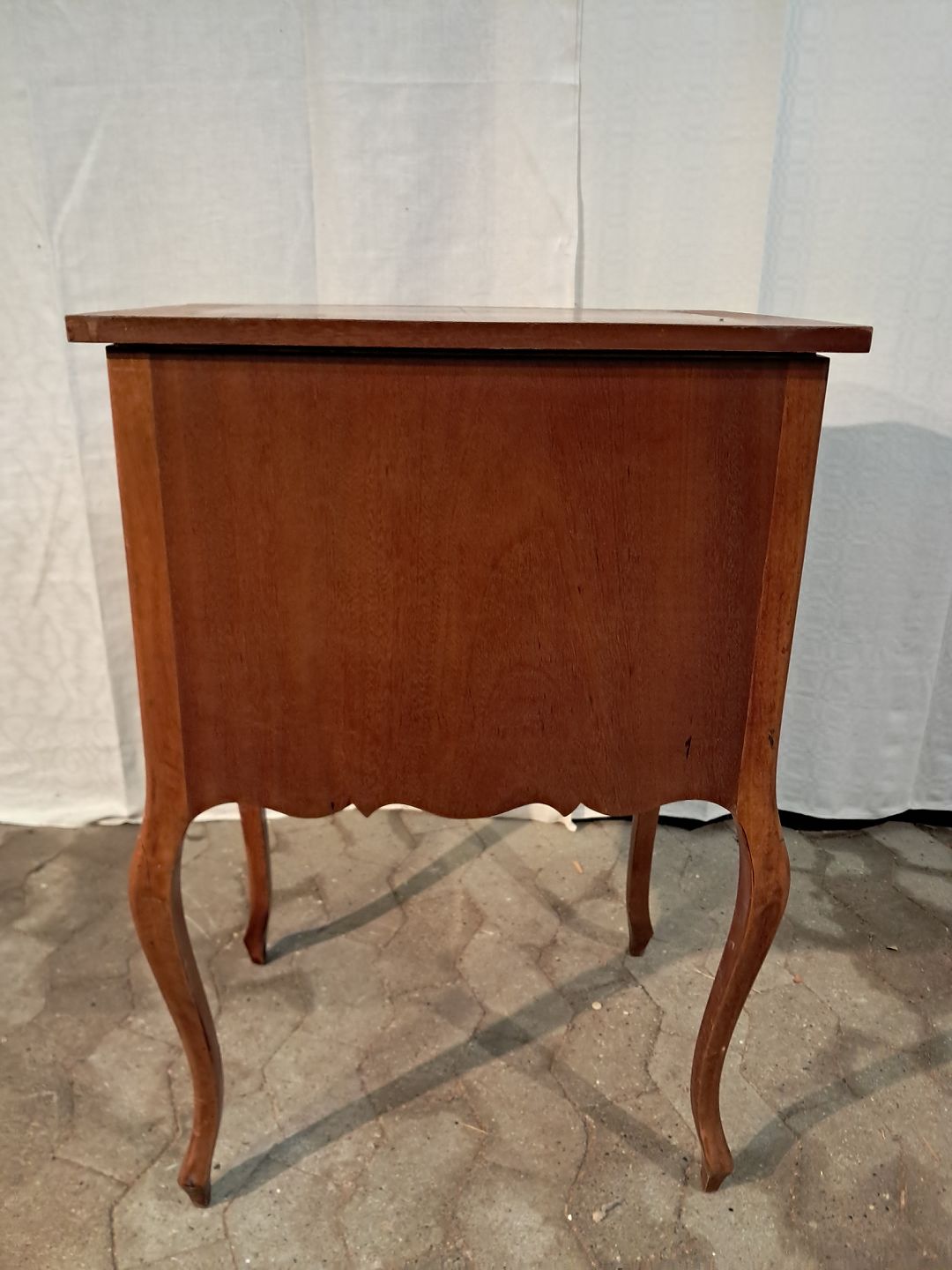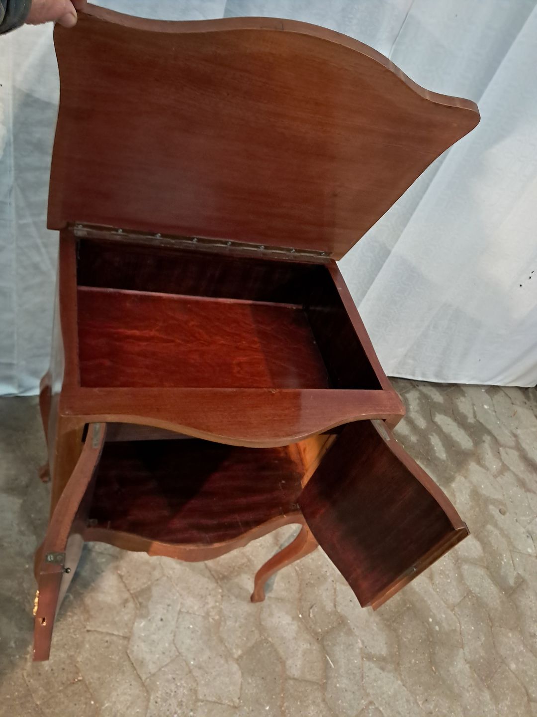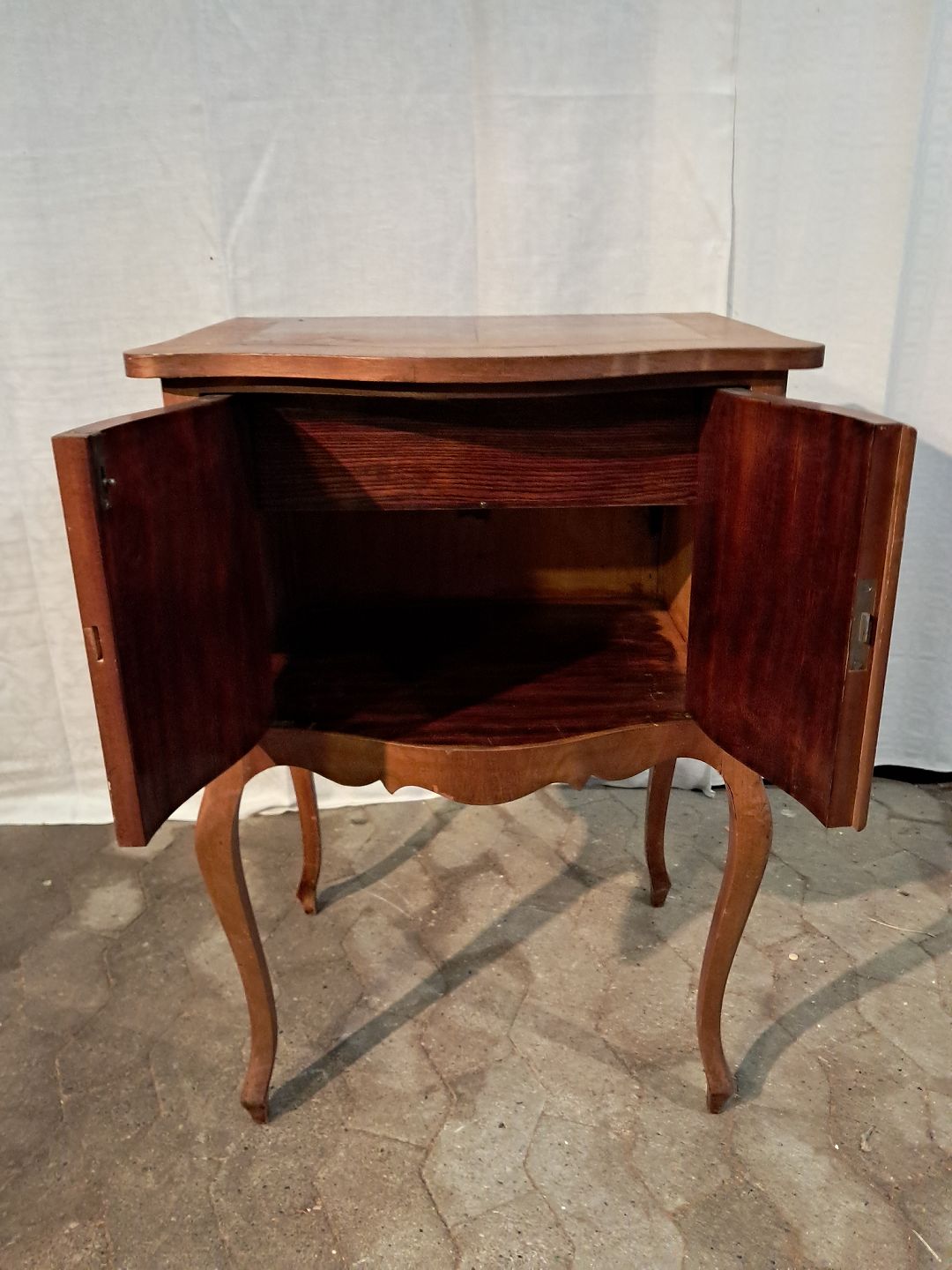 Skab i fineret mahogni og massivt bøgetræ, fra 1980erne. Det har brugsspor og højre bagben har en revne. Højde 82cm Bredde 56cm Dybde 47cm Emne nummer: 91336
