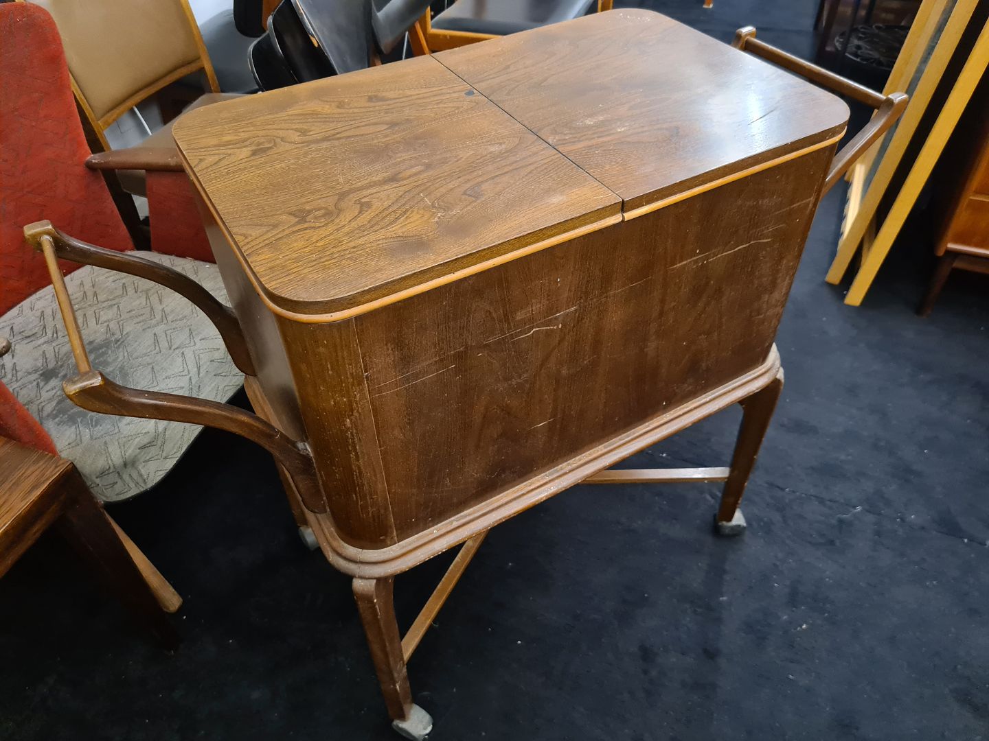 Barskab fra 1950'erne i bejdset elm og på hjul. Fremstår i ok brugt stand og udmærket funktionsdygtigt. Dog med lidt overfladeridser og indvendige brugsspor der anes på billedet.