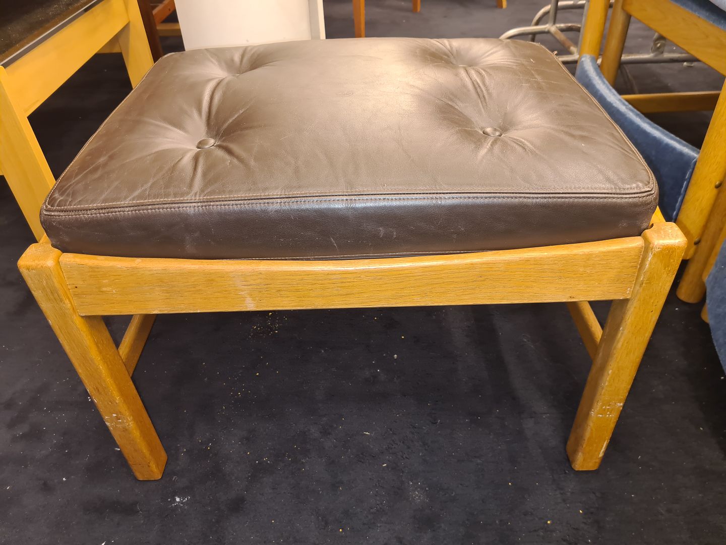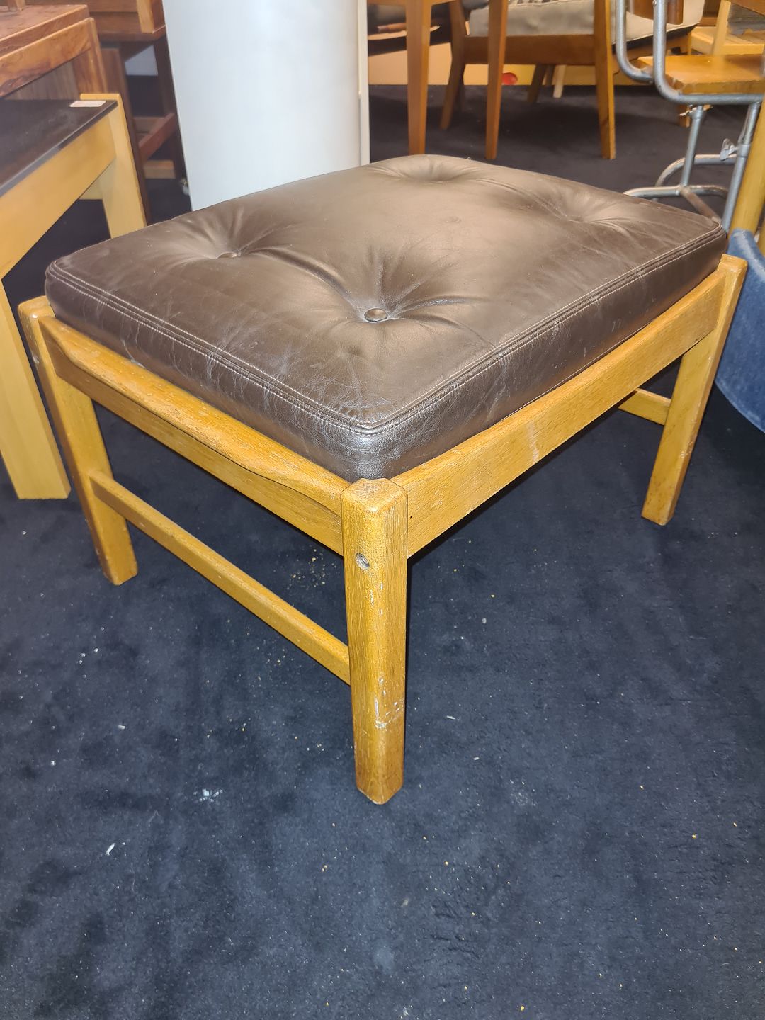 Svensk Design fodskammel fra 1970'erne i eg med brun læderhynde. Fremstår pæn og velholdt uden nævneværdige brugsspor. Højde 40 cm. Længde 60 cm. Bredde 47 cm. Emne nummer: 80645