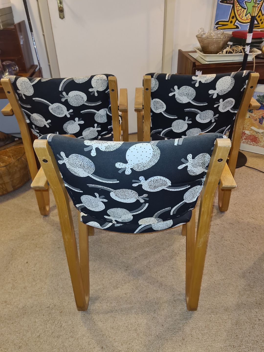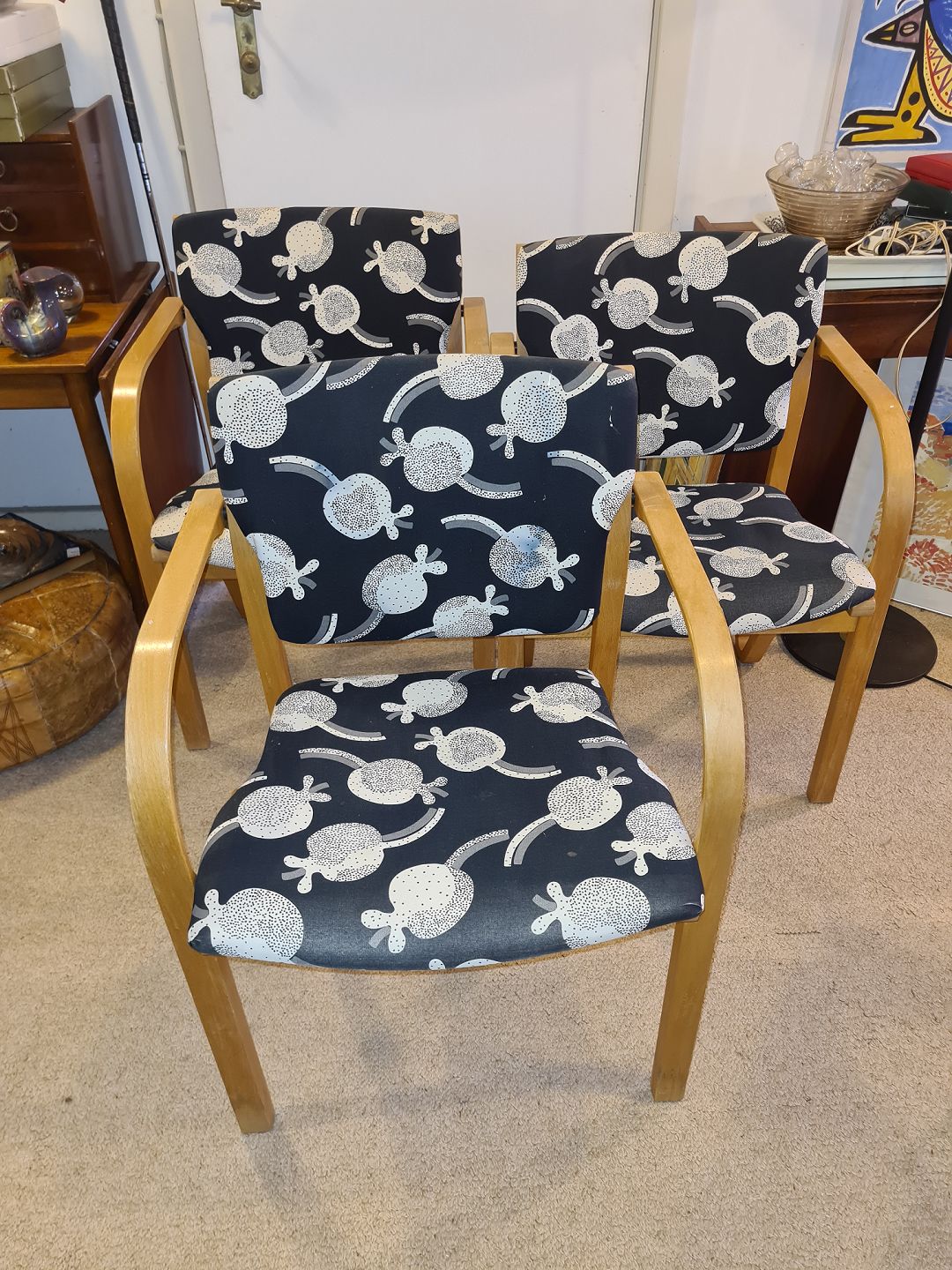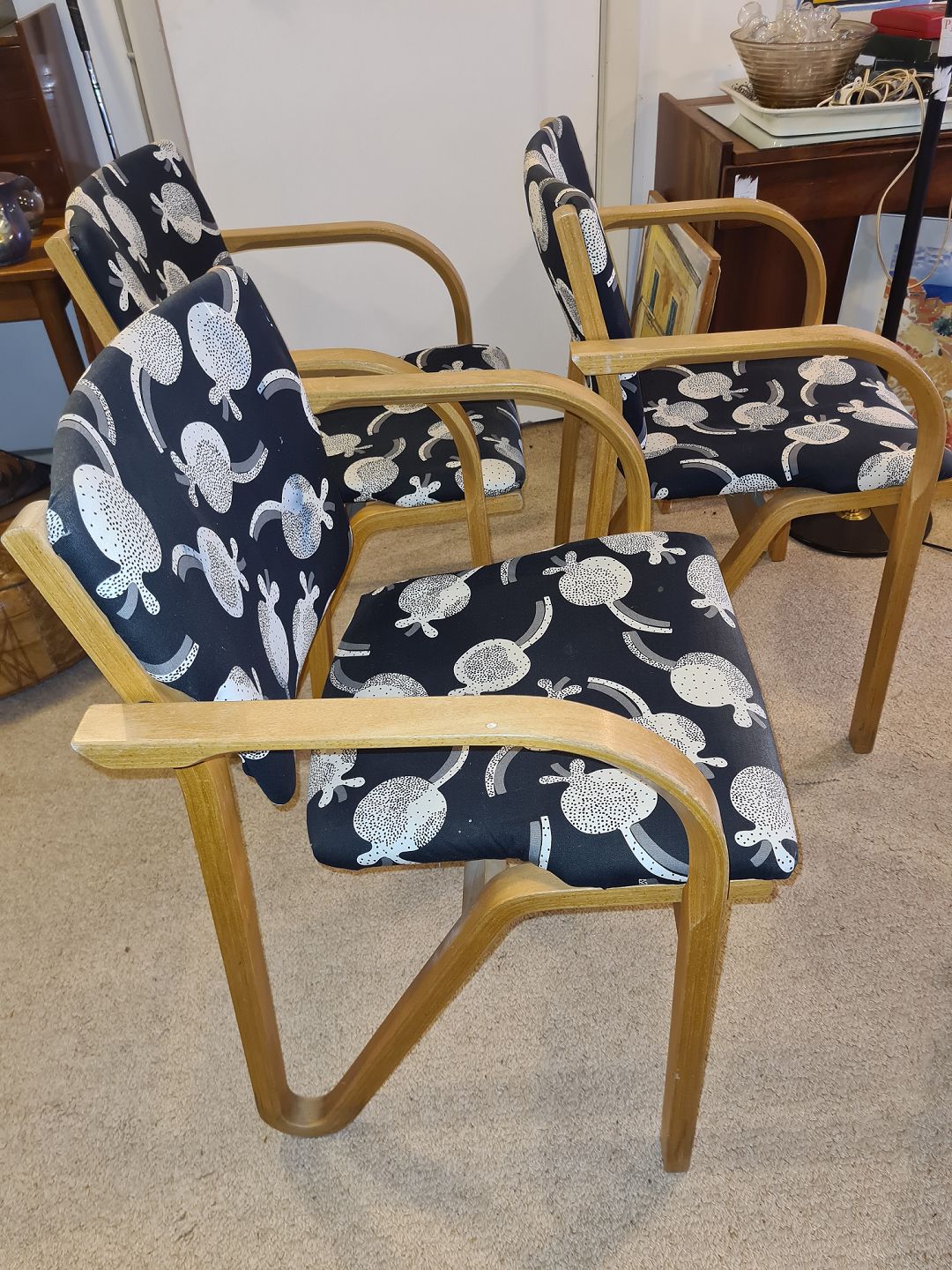 3 Armstole fra 1990'erne i bøg og med overpolstret sæde og ryg. Fremstår pæne og stabile dog med lettere tyndslidt stof på kanterne.