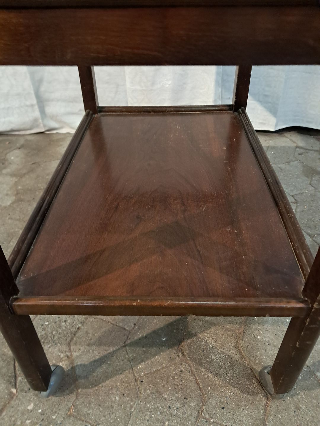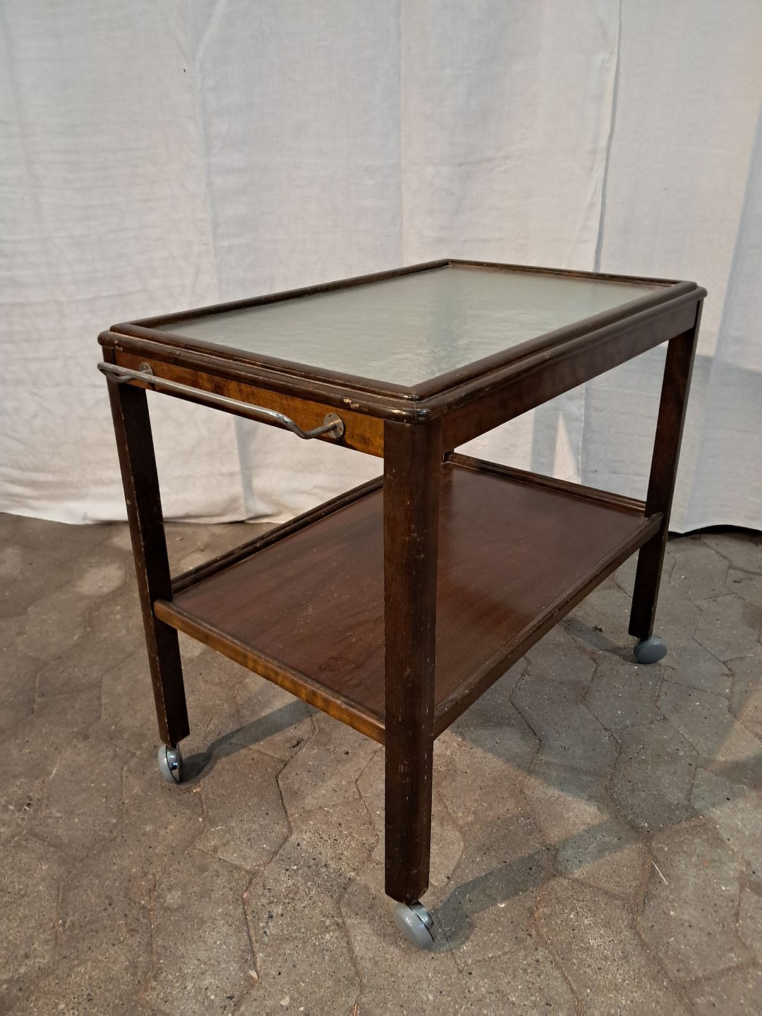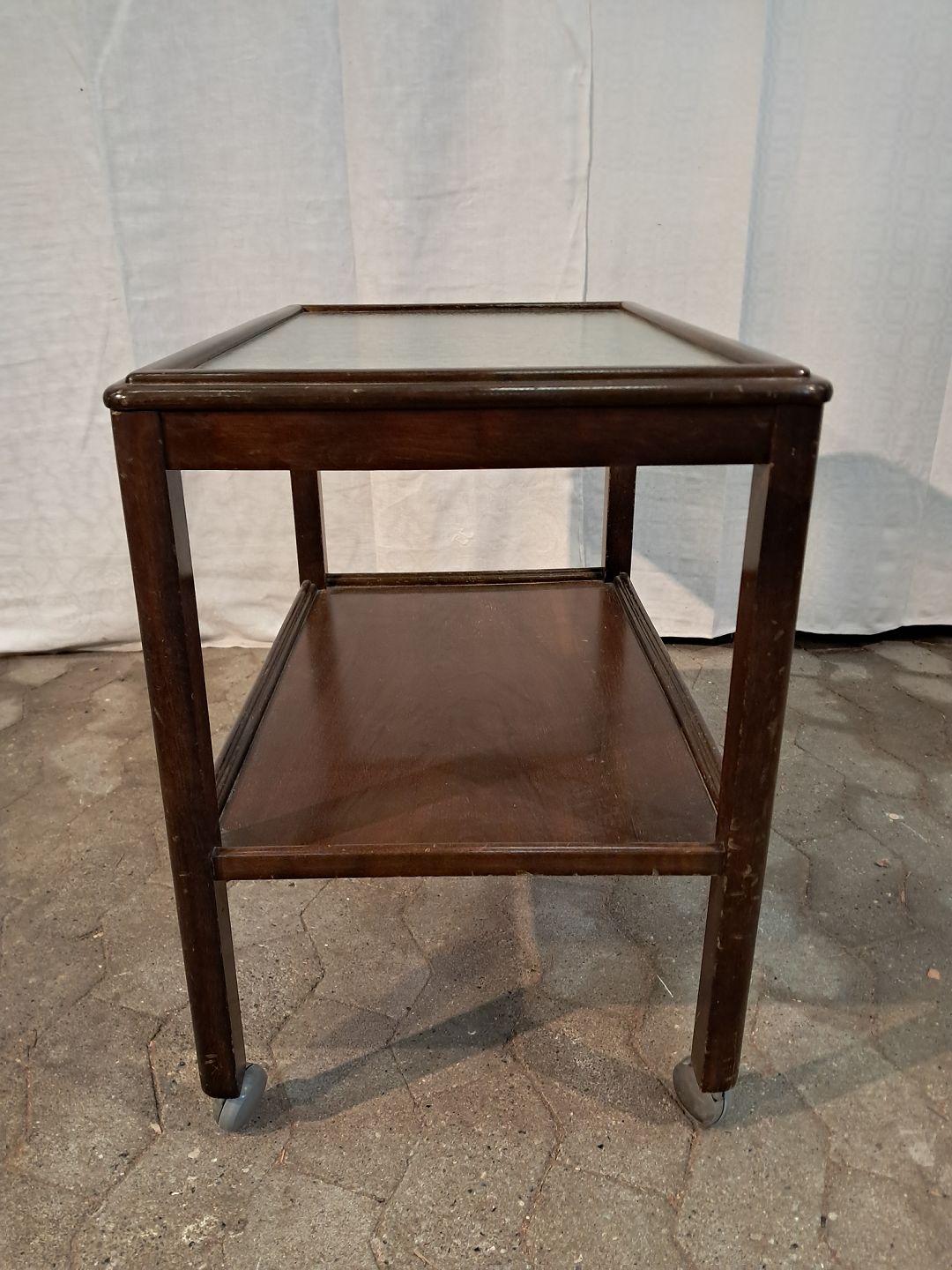 Bord i massivt birketræ med glasplade, fra 140erne. Det har brugsspor og hjulene køre dårligt. Højde 62cm Bredde 44cm Længde 66cm Emne nummer: 91368