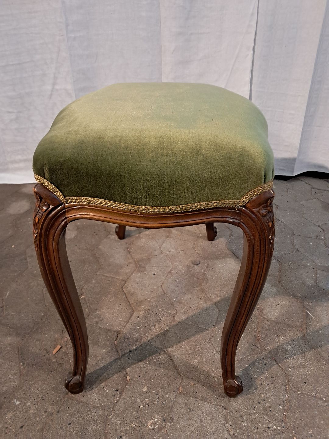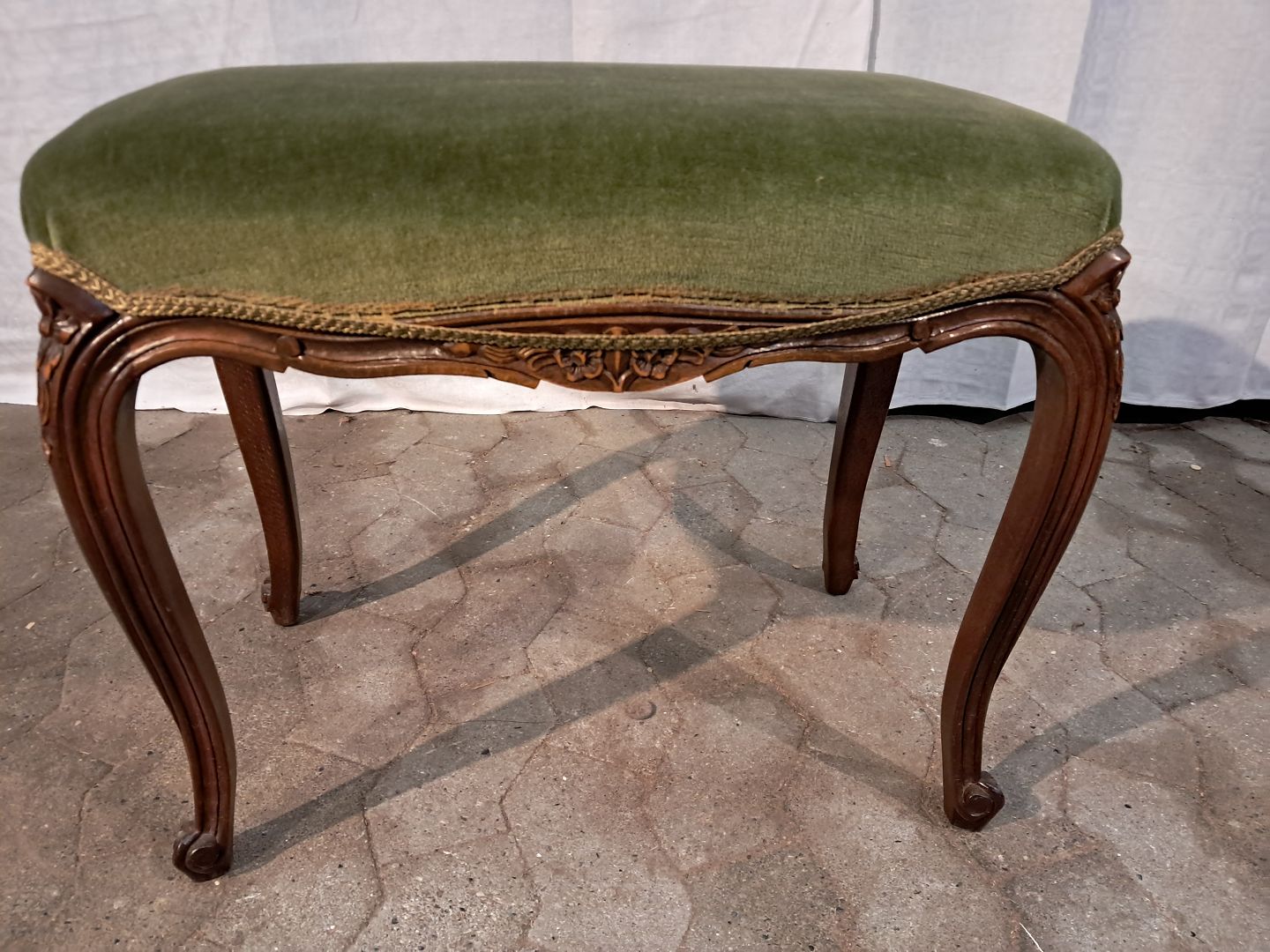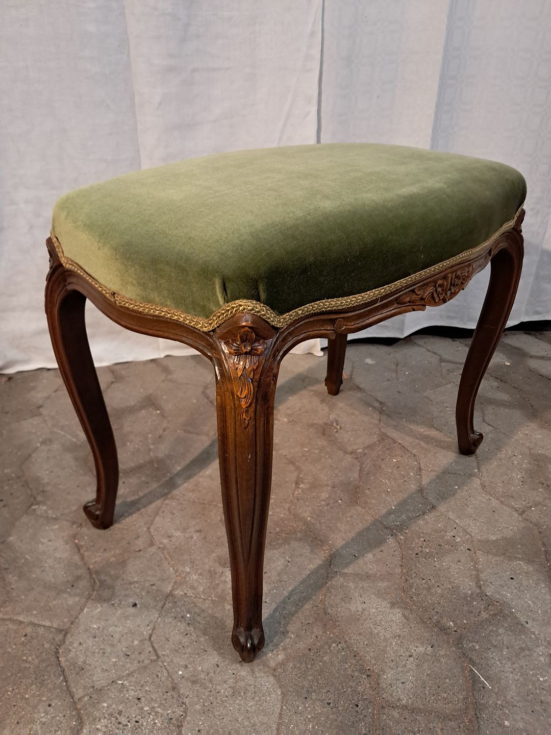 Skammel i massivt bøgetræ med velour betræk, fra 1980erne. Den har brugsspor. Højde 50cm Bredde 40cm Længde 63cm Emne nummer: 91379