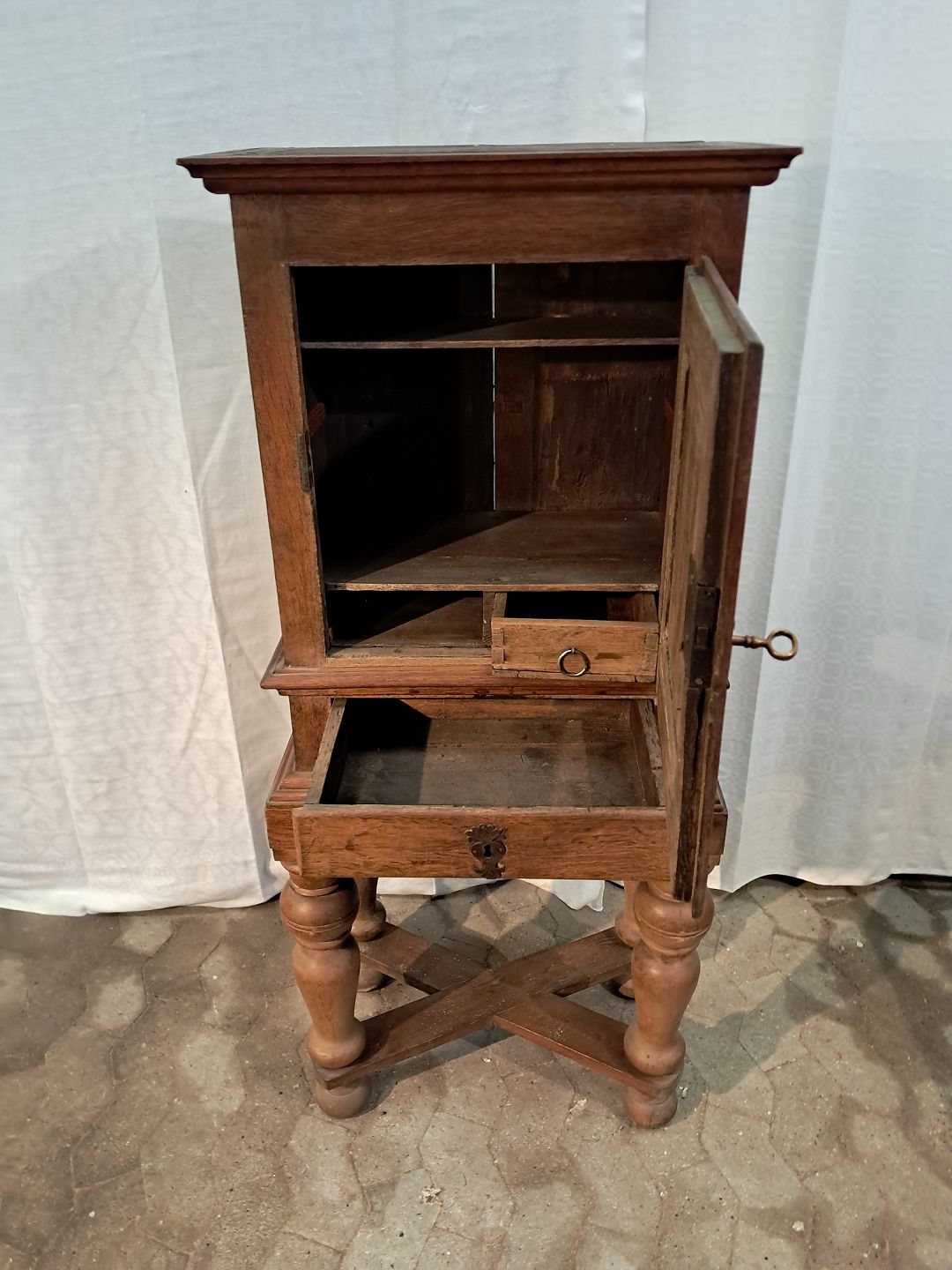 Skab i massivt egetræ, fra 1880erne. Det har brugsspor. Højde 140cm Bredde 61cm Dybde 35cm Emne nummer: 91401