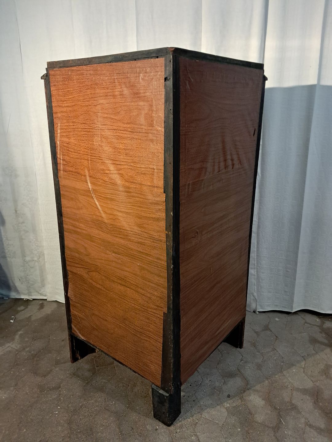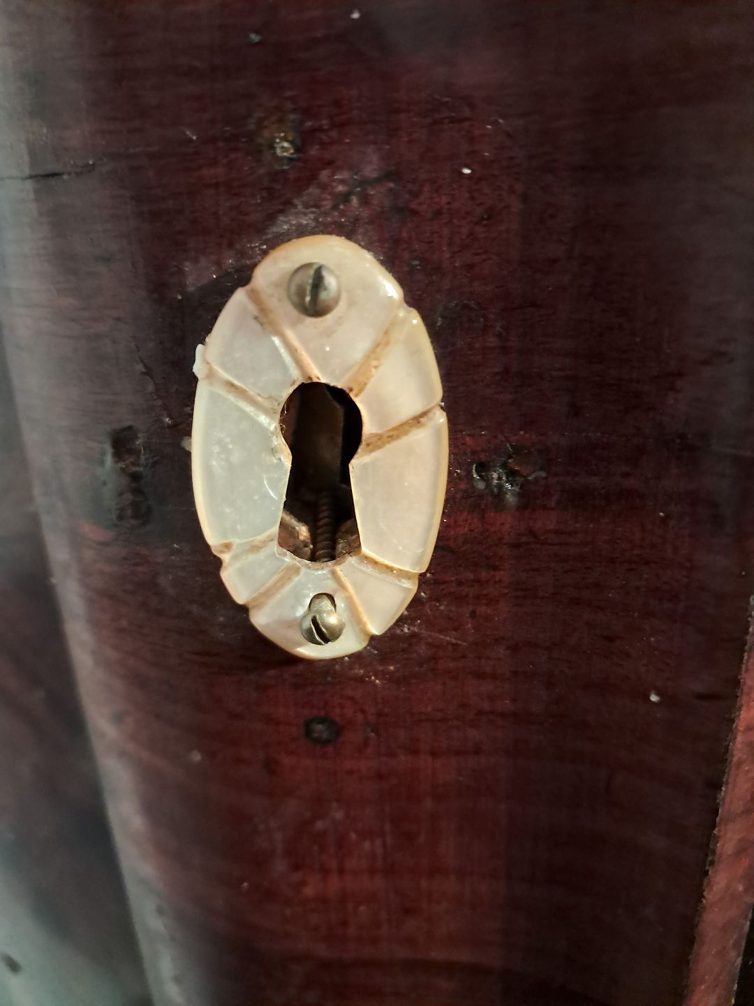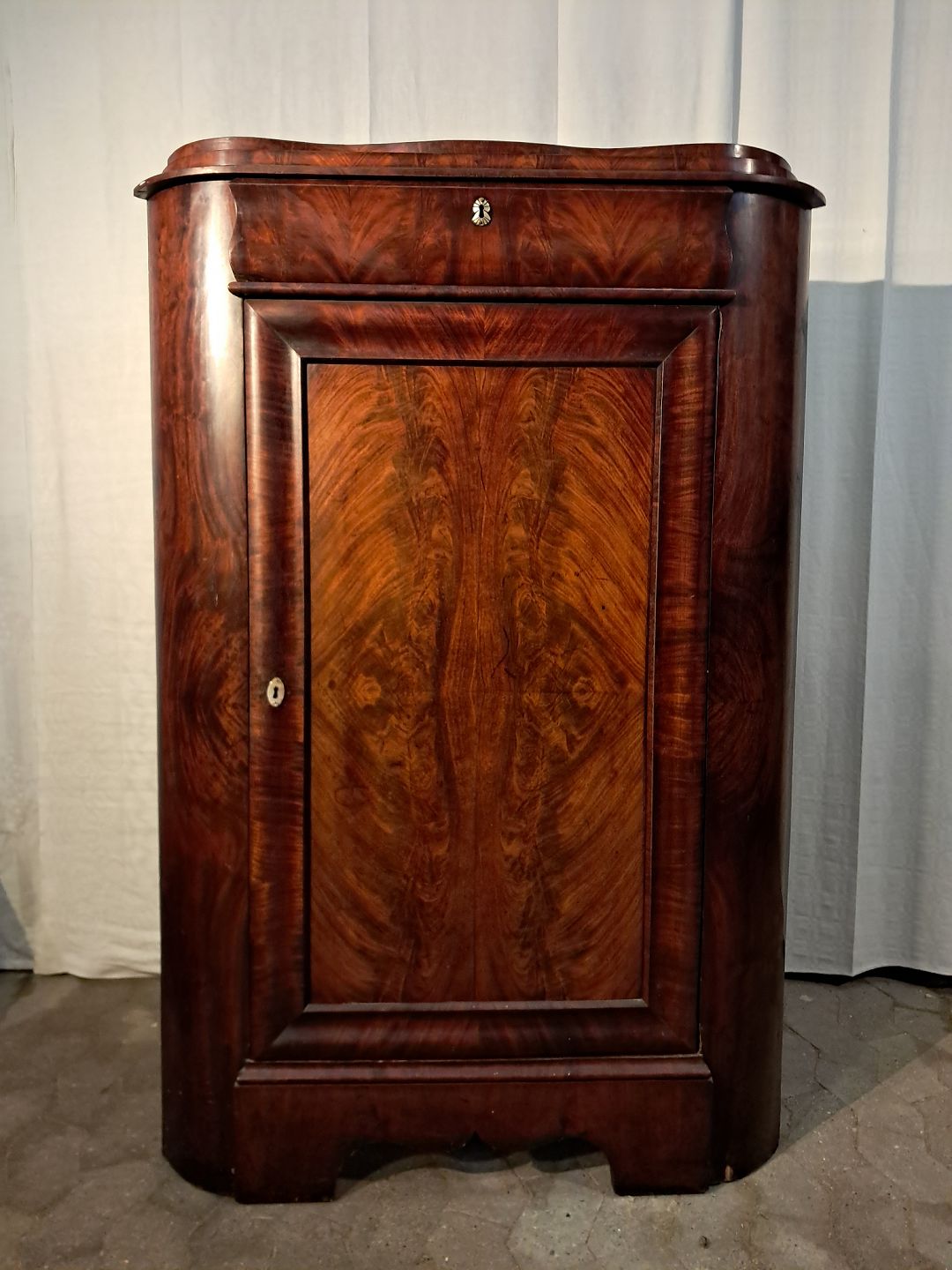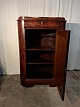 Hjørneskab i fineret mahogni, fra 1890erne. Det har brugsspor og et løst låsebeslag. Højde 147cm Bredde 93cm Dybder 69cm Emne nummer: 91417