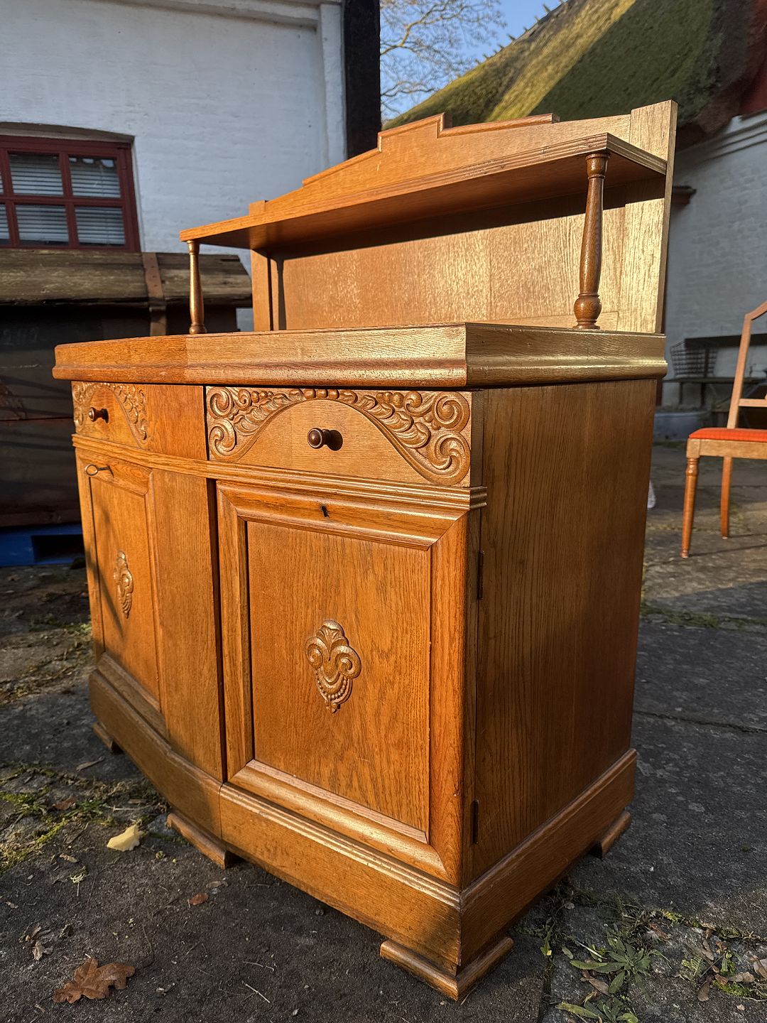 Anrettermøbel i egetræ fra ca 1920'erne. Det er i pæn brugt stand. Højde 118 cm. Bredde 98 cm. Dybde 55 cm. Pladehøjde 80 cm. Emne nummer: 91441