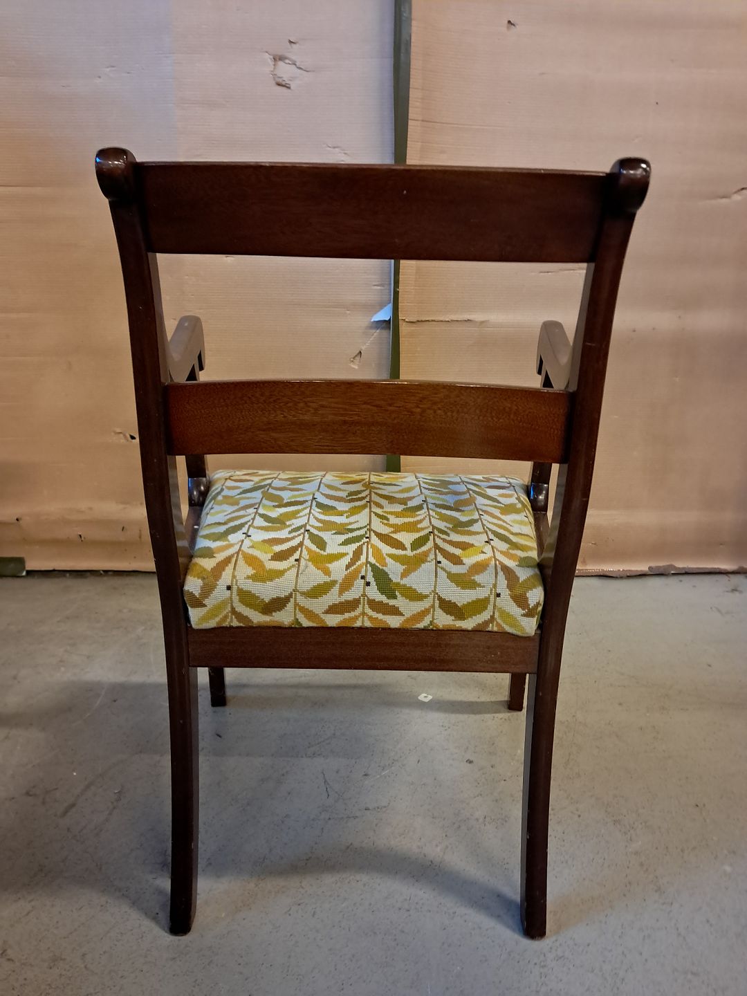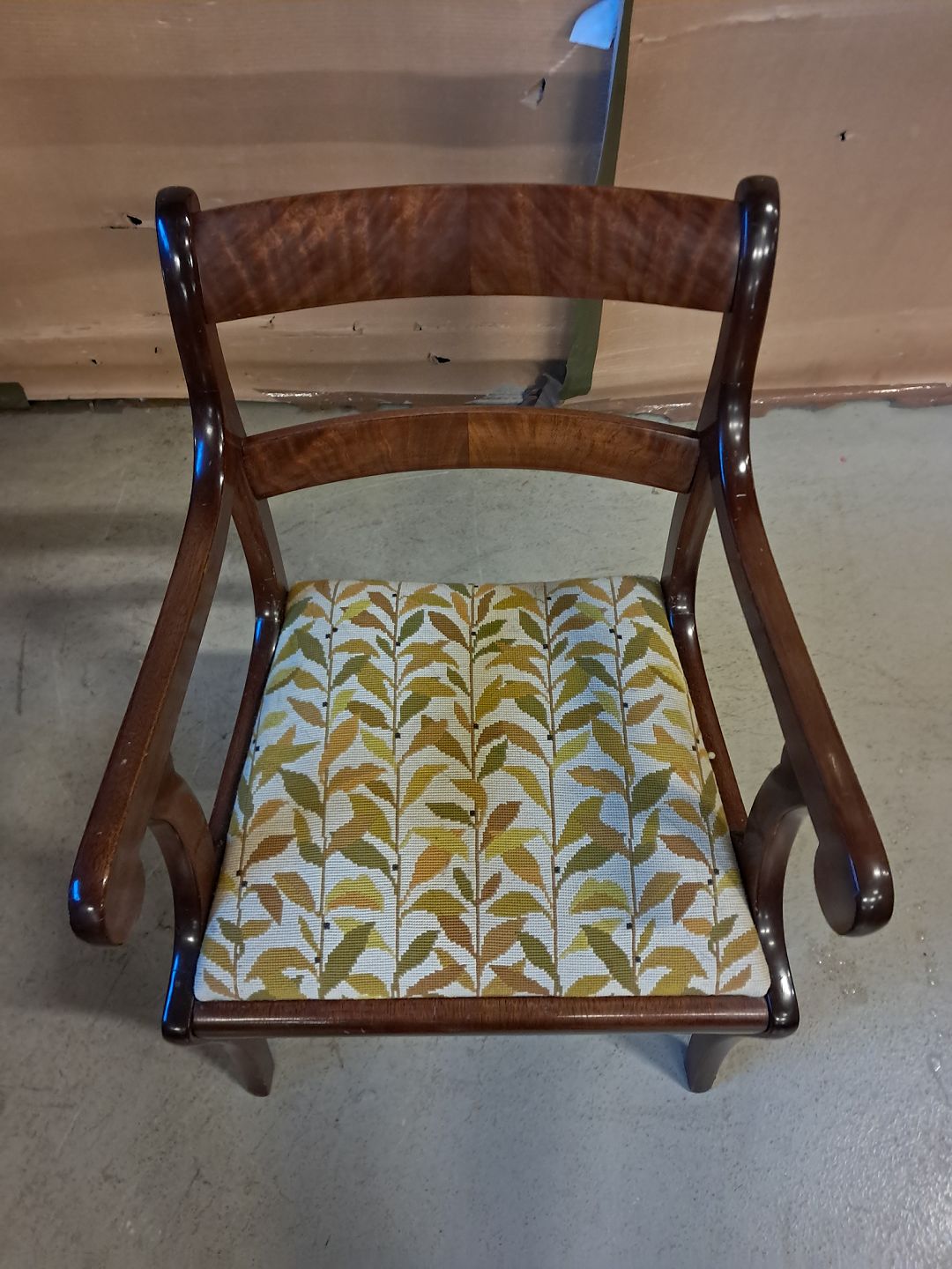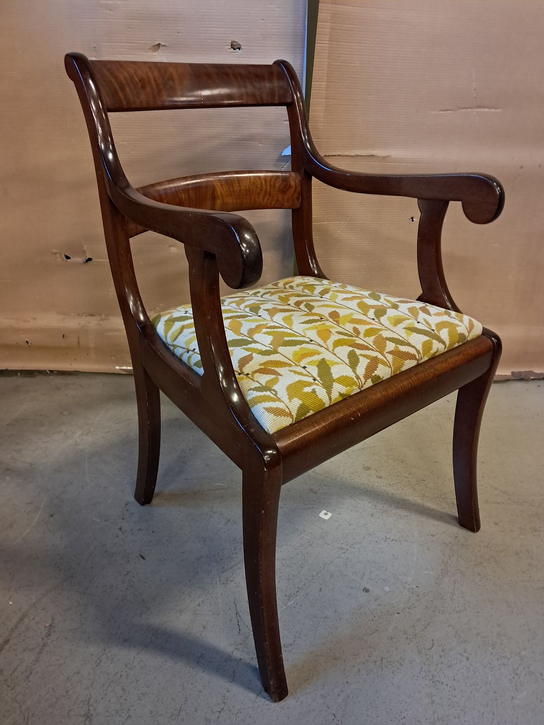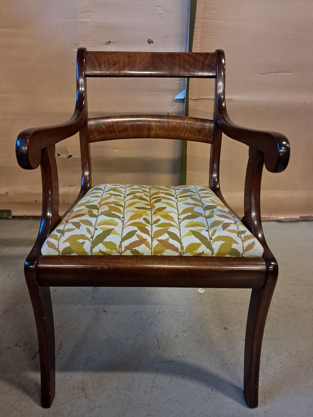Armstol i mahogni og bøgetræ med broderet betræk, fra 1910erne. Den har brugsspor. Ryghøjde 85cm Sædehøjde 45cm Emne nummer: 76112