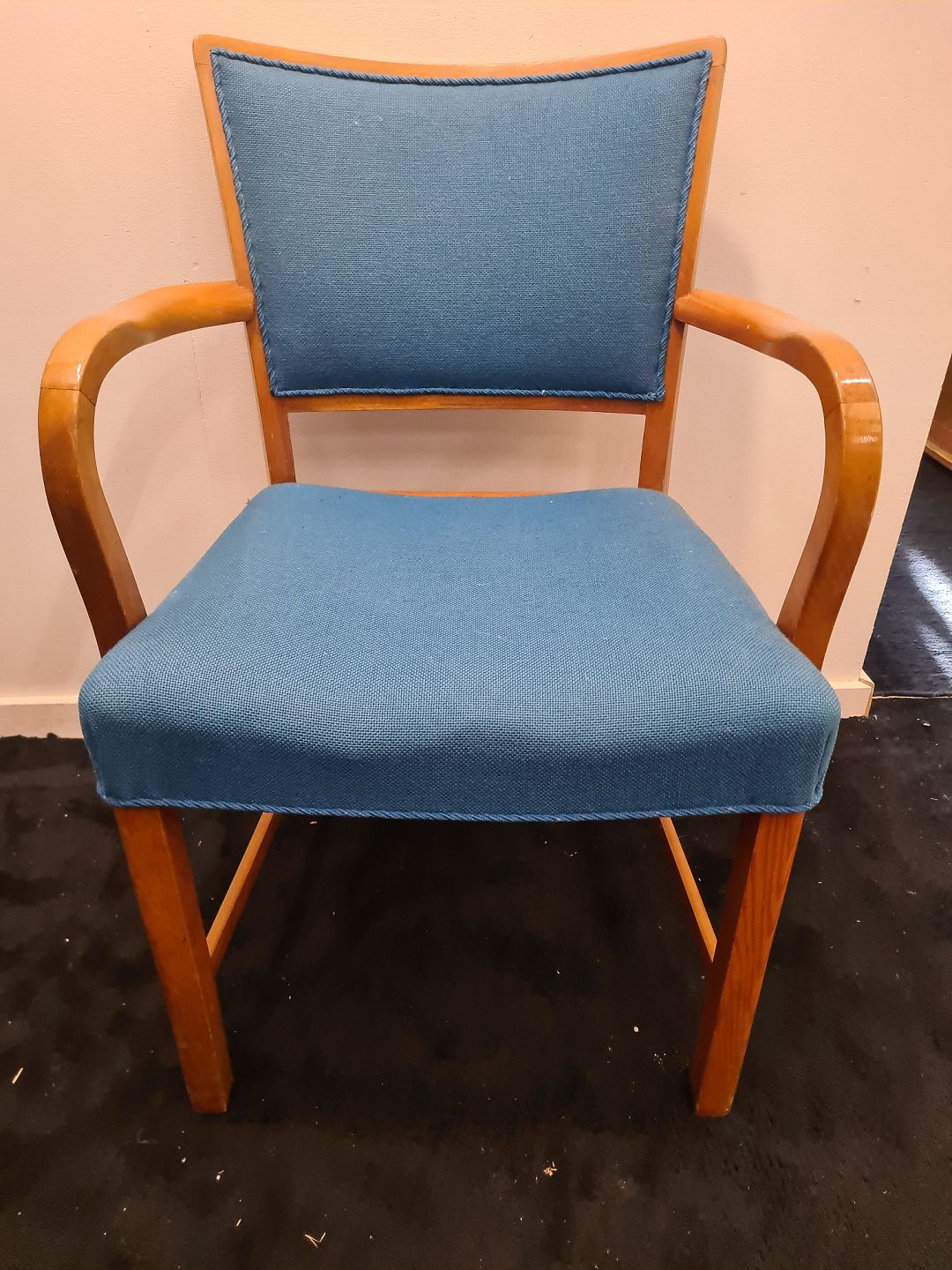 Dansk snedkermester armstol udført i lys lakeret Elm betrukket med uld stof.