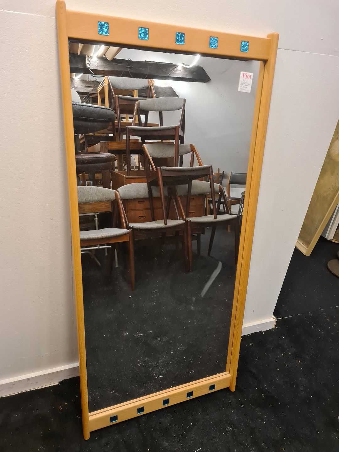 Svensk design spejl med ramme i eg og indlagt farvet råglas.