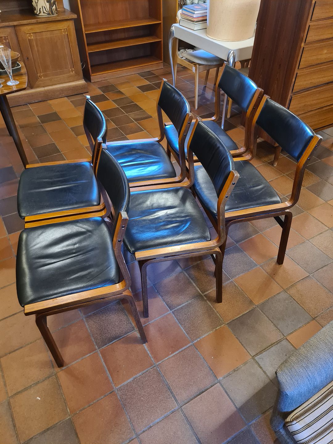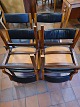 Dansk møbeldesign sæt af 6 spisebordsstole i formbøjet palisander, betrukket med sort skind. Produceret ca. 1970'erne Fremstår i pæn brugt stand. Mål: H. 80 cm. B. 48 cm. D. 50 cm. SH. 47 cm. Emne nummer: 80746