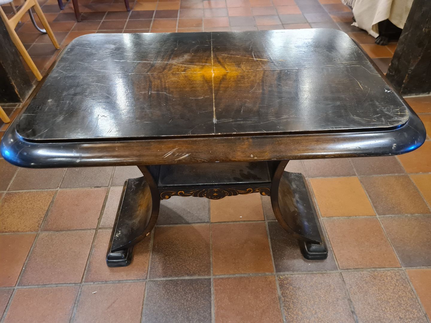 Funkis stil sofabord udført i fineret bejdset birketræ. Produceret af dansk møbelsnedker ca. 1930'erne. Fremstår med brugsspor og skrammer på plade. Mål: H. 59 cm. B. 56 cm. D. 86 cm. Emne nummer: 80753